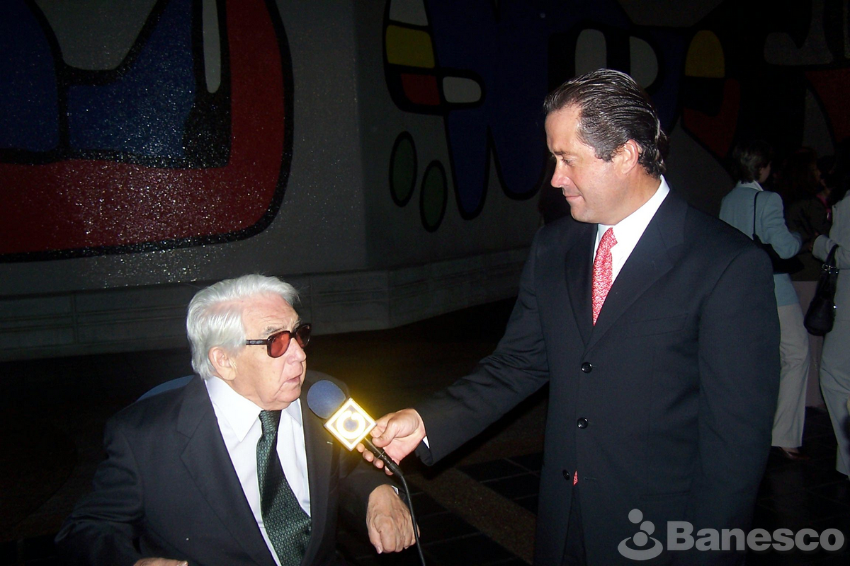 Juan Carlos Escotet Rodríguez entrevista a Oswaldo Vigas durante la inauguración de su obra La Trilogía, realizado especialmente para Ciudad Banesco, en Caracas.