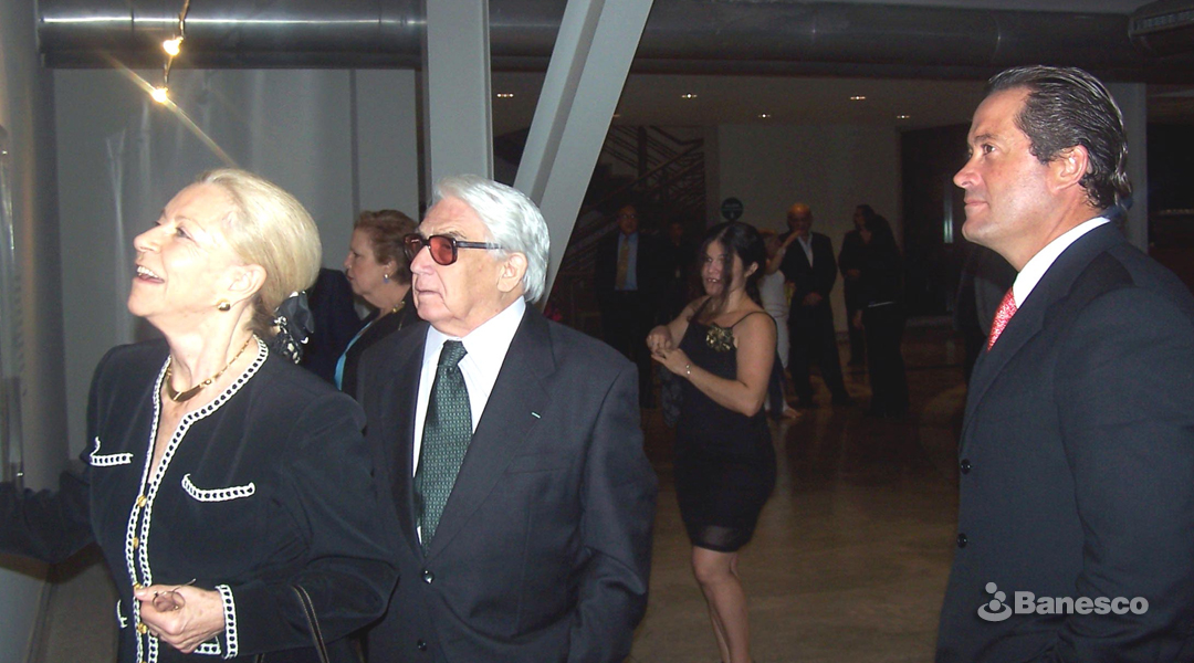 Oswaldo Vigas junto a su esposa y Juan Carlos Escotet durante la inauguración del mural La trilogía, realizado especialmente para la Ciudad Banesco, en Caracas.