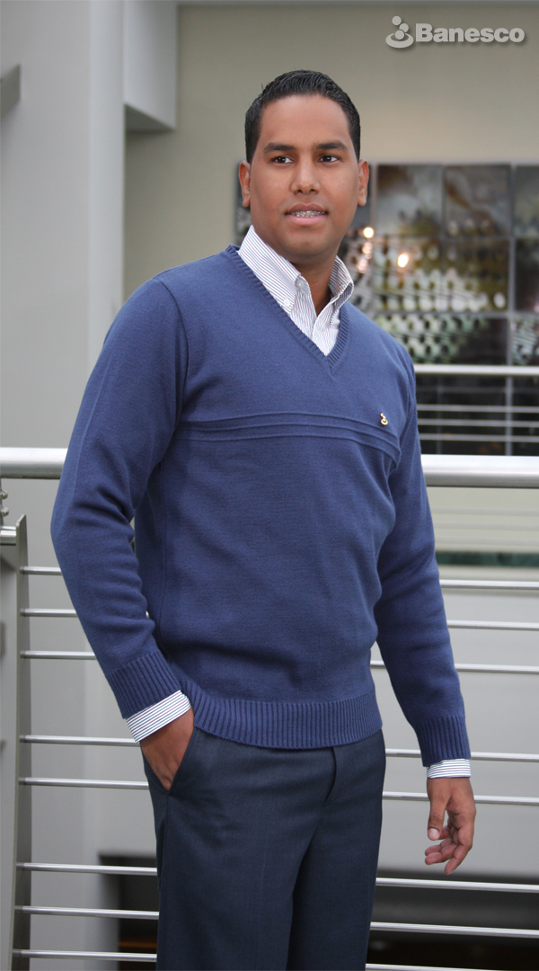Uniforme Corporativo Banesco con camisa de rayas, sueter azul marino y pantalón azul marino de caballero.