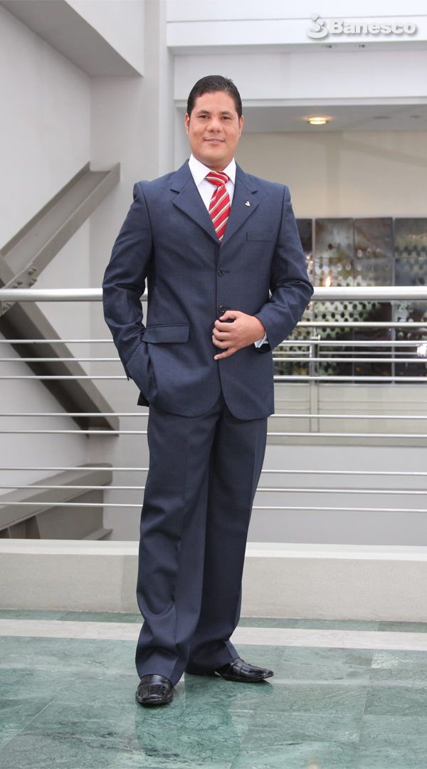 Vestimenta formal ejecutiva para caballeros perteneciente a los Ciudadanos Banesco, conformado por una camisa blanca, corbata roja de rayas y un traje formal de color azul marino para caballeros.