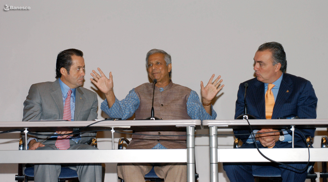Muhammad Yunus entre Juan Carlos Escotet Rodríguez y Luis Xavier Lujan