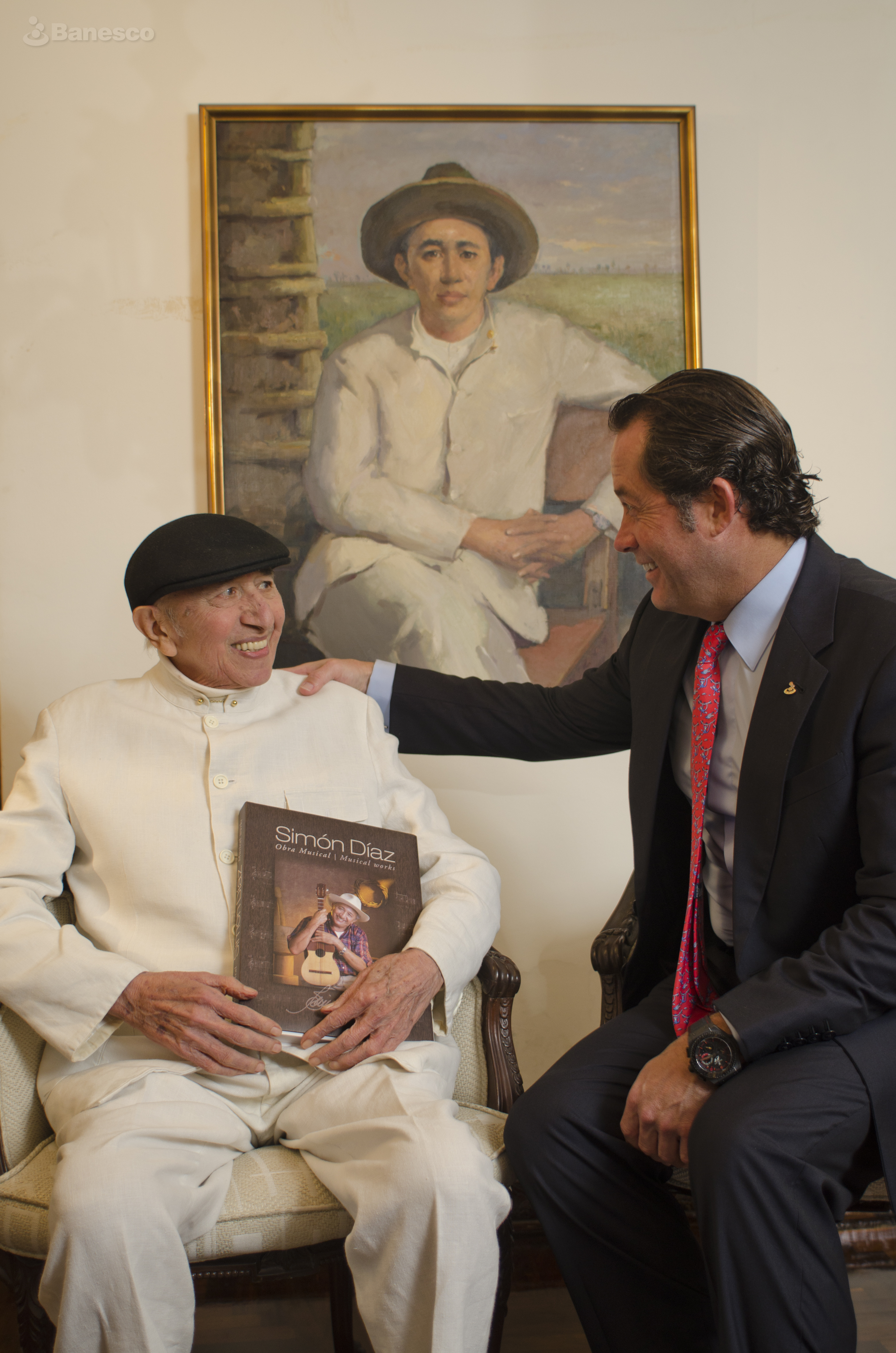 Juan Carlos Escotet Rodríguez haciendo entrega del primer ejemplar del Libro "Obras de Simón Díaz" al célebre cantante, compositor, poeta y humorista venezolano Simón Díaz.