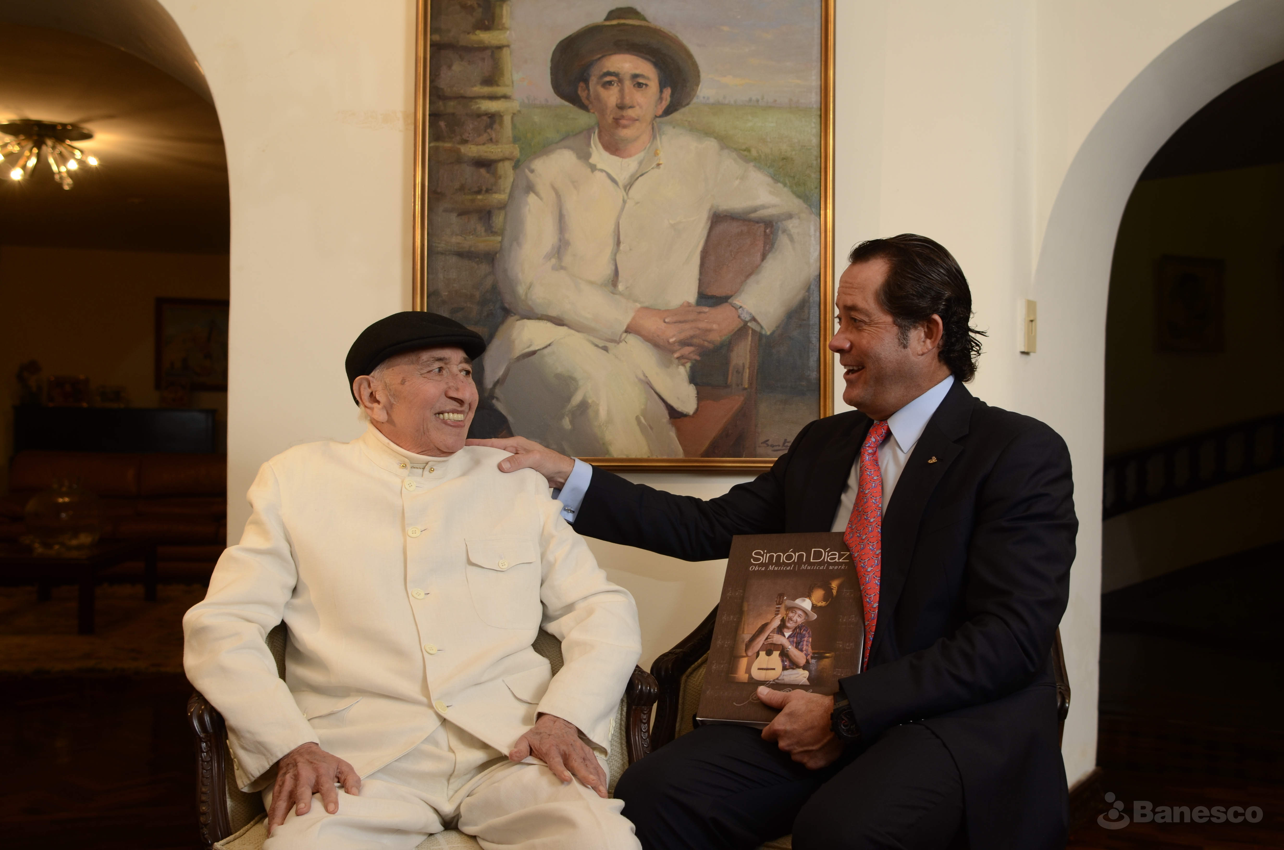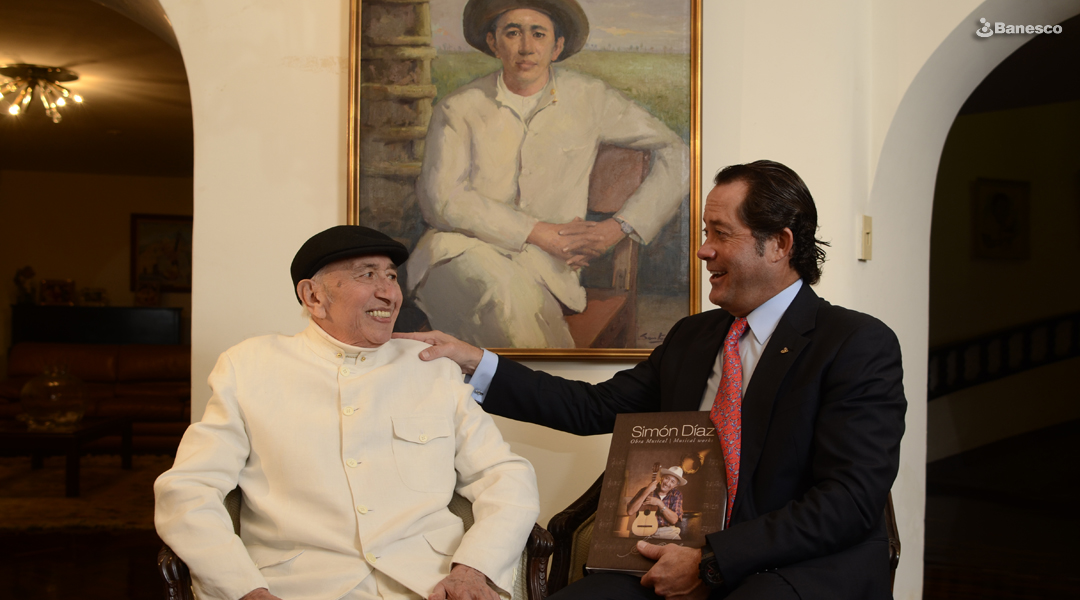 Juan Carlos Escotet Rodríguez haciendo entrega del primer ejemplar del Libro "Obras de Simón Díaz" al célebre cantante, compositor, poeta y humorista venezolano Simón Díaz.