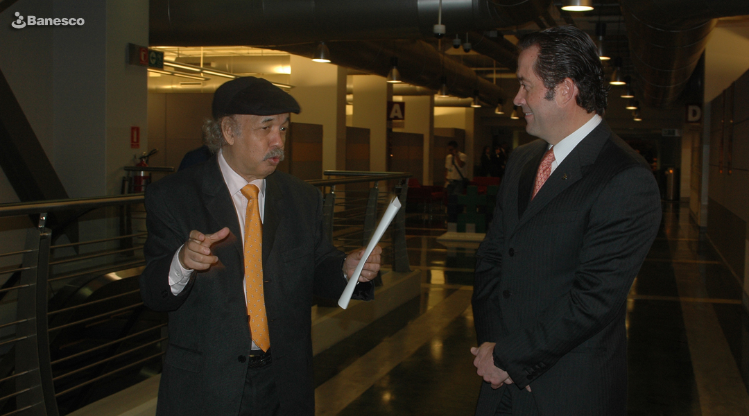 Juan Carlos Escotet Rodríguez junto al pintor y dibujante Jacobo Borges durante recorrido por los espacios de Ciudad Banesco.