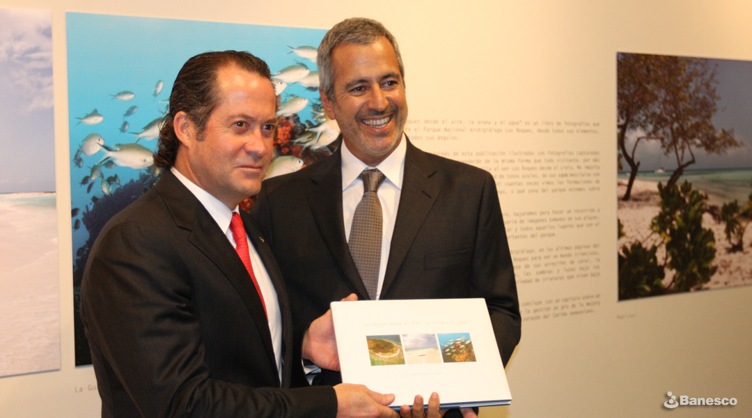 Juan Carlos Escotet Rodríguez y Federico Cabello, fotógrafo venezolano,en la presentación del libro: Los Roques desde el aire, la arena y el agua.