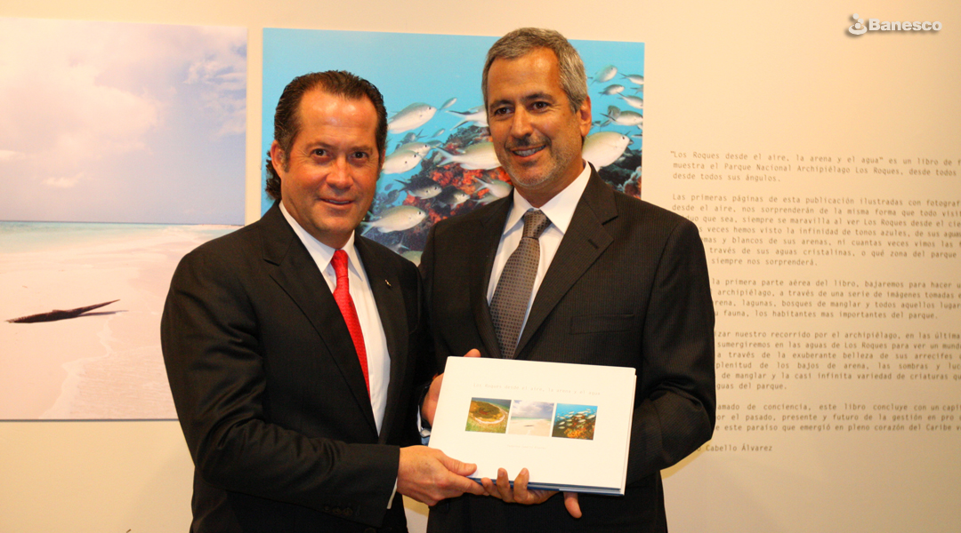Juan Carlos Escotet Rodríguez junto a Federico Cabello en la presentación del libro Los Roques desde el aire, la arena y el agua.