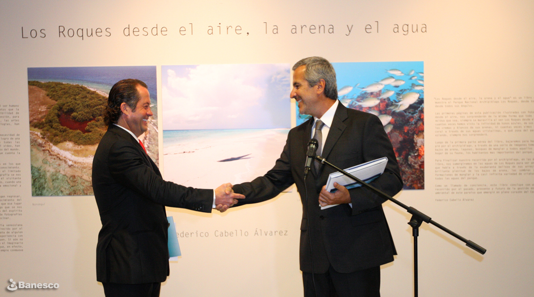 Apretón de manos entre Juan Carlos Escotet Rodríguez y el fotógrafo venezolano Federico Cabello.
