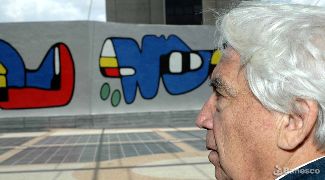El artista venezolano, Oswaldo Vigas y al fondo el Mural "Trilogía" realizado por él para los espacios de la sede de Ciudad Banesco.