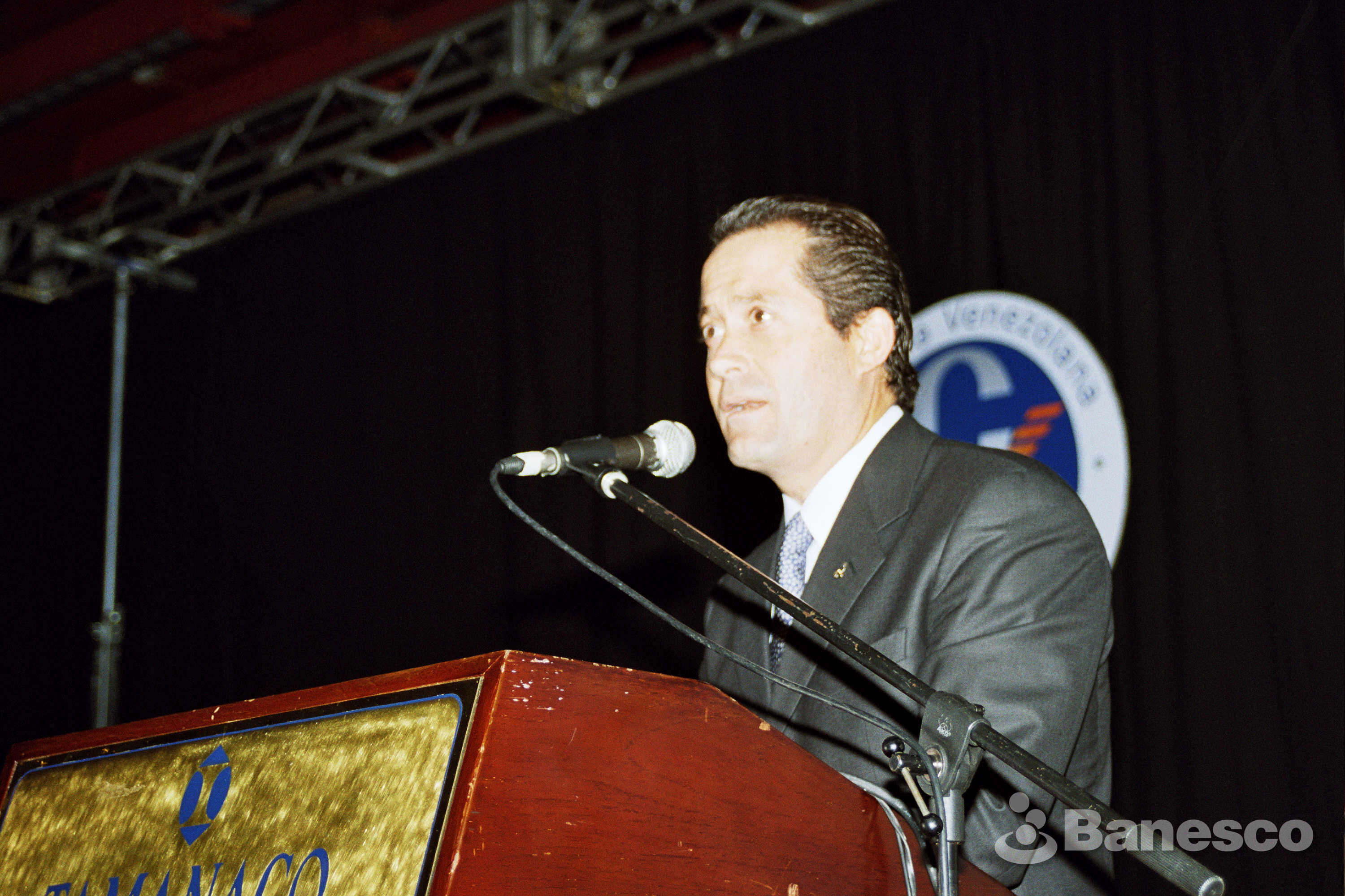 El Presidente de Banesco Banco Universal, dando unas palabras de agradecimiento luego de obtener el Premio Anual de la Construcción 2004 entre un máximo de cinco postulaciones.