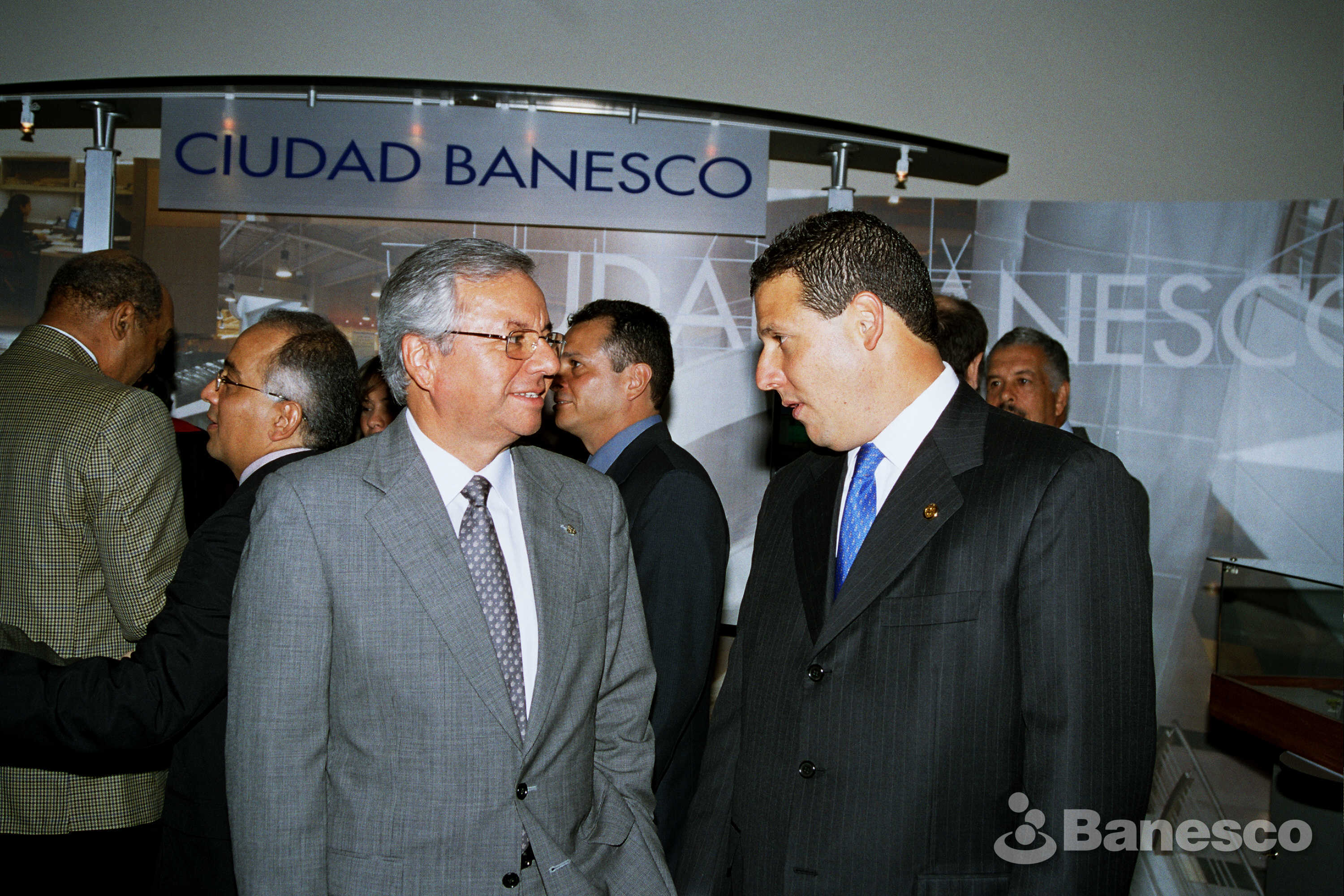 Nelson Orlando Becerra Méndez, Director de Banesco conversando con el Ingeniero Jaime Gómez en el acto de premiación de la construcción otorgado a Ciudad Banesco por la Cámara Venezolana de la Construcción.