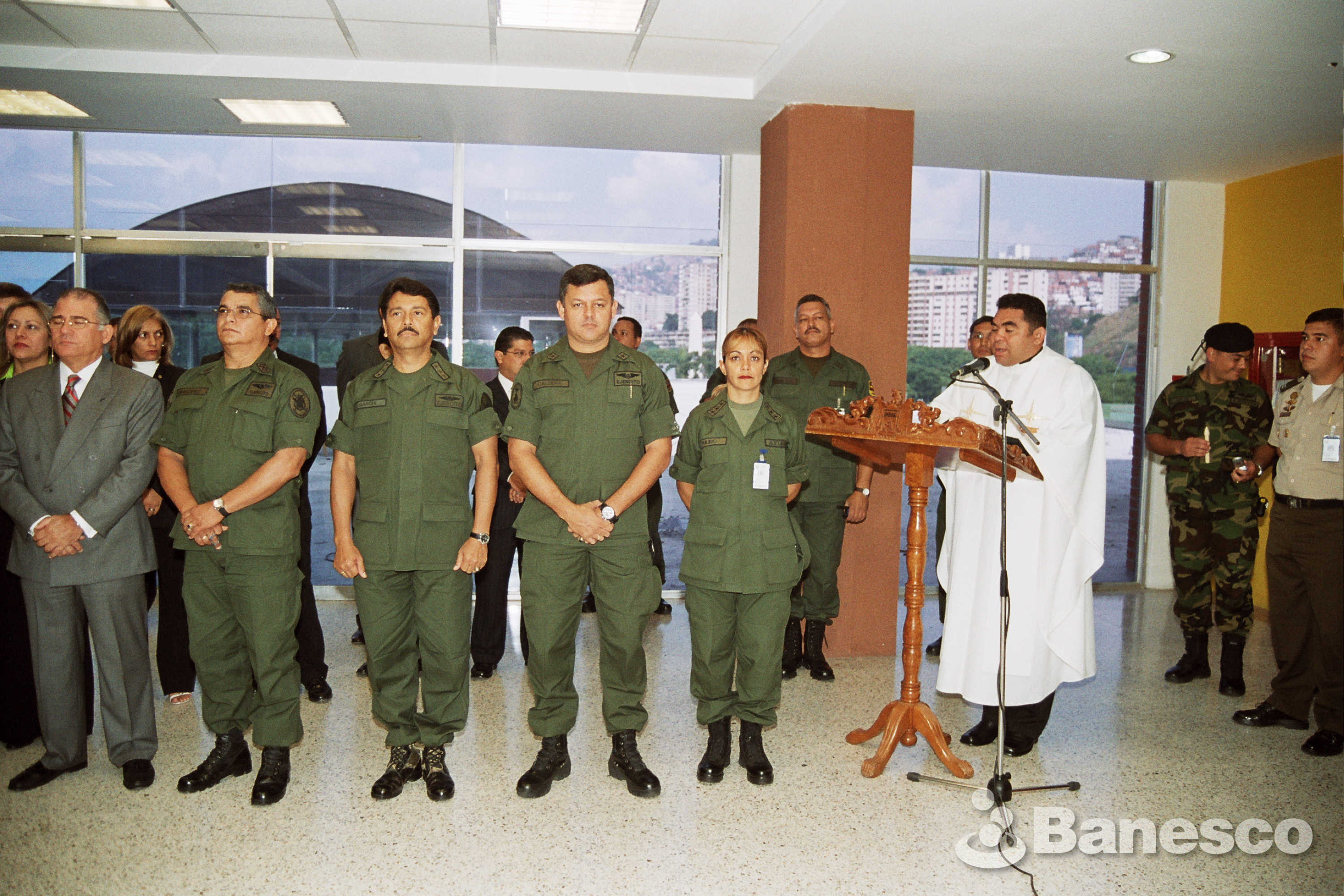 Grupo de oficiales del IPSFA, escuchan atentamente las palabras del sacerdote al momento de realizar la misa y bendecir la agencia.