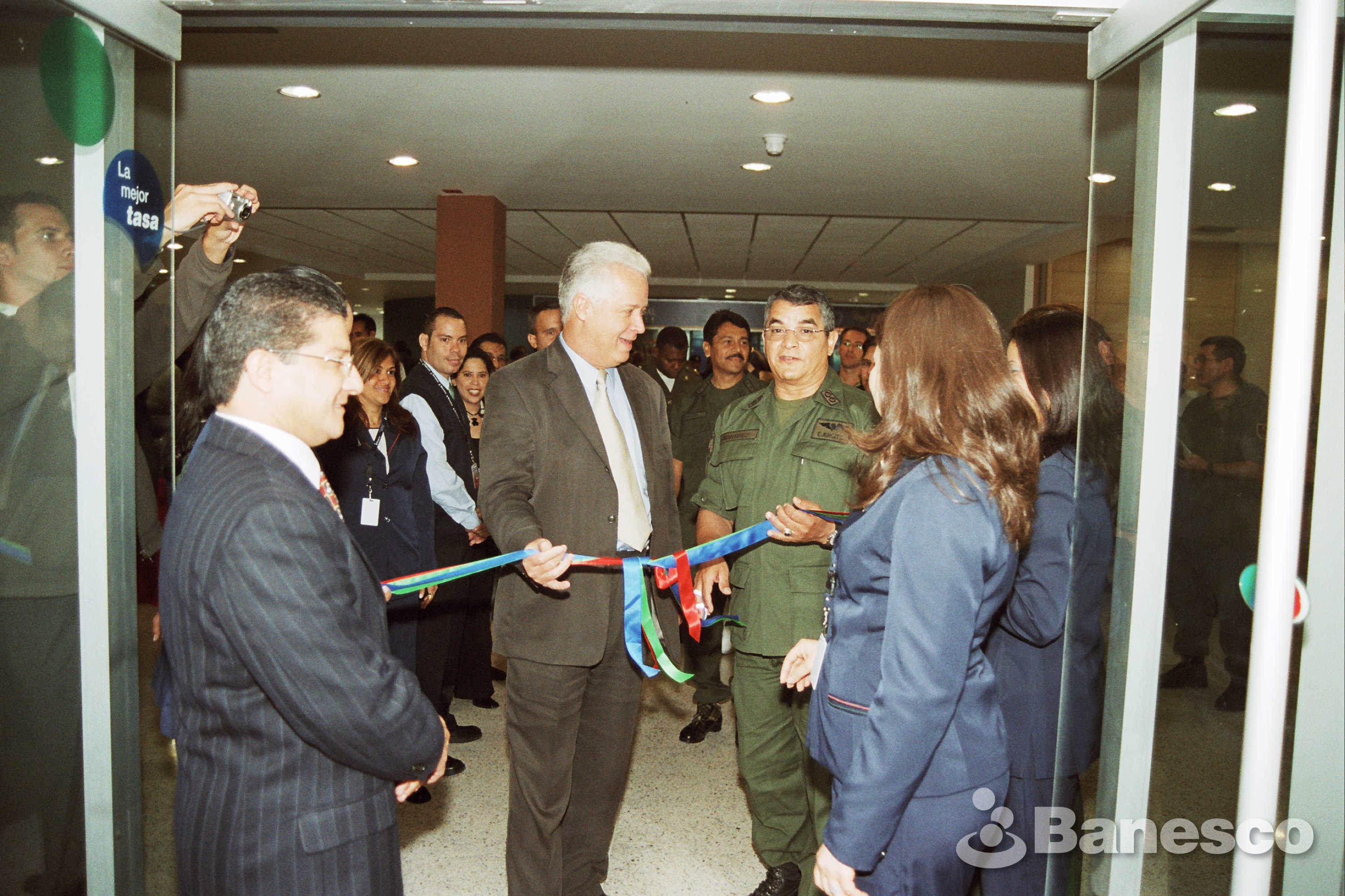 Representantes de Banesco y del Instituto de Previsión Social de la Fuerza Armada (IPSFA) realizan el corte de cinta para inaugurar la nueva agencia de la institución bancaria.