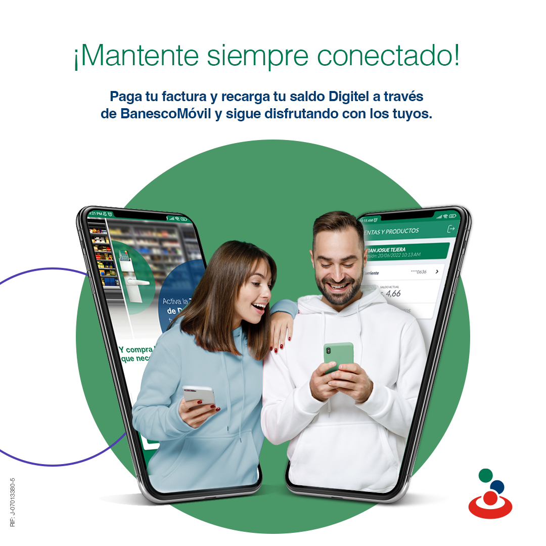 Paga tu factura y recarga tu saldo Digitel a través de BanescoMóvil o BanescOnline y sigue disfrutando con los tuyos.