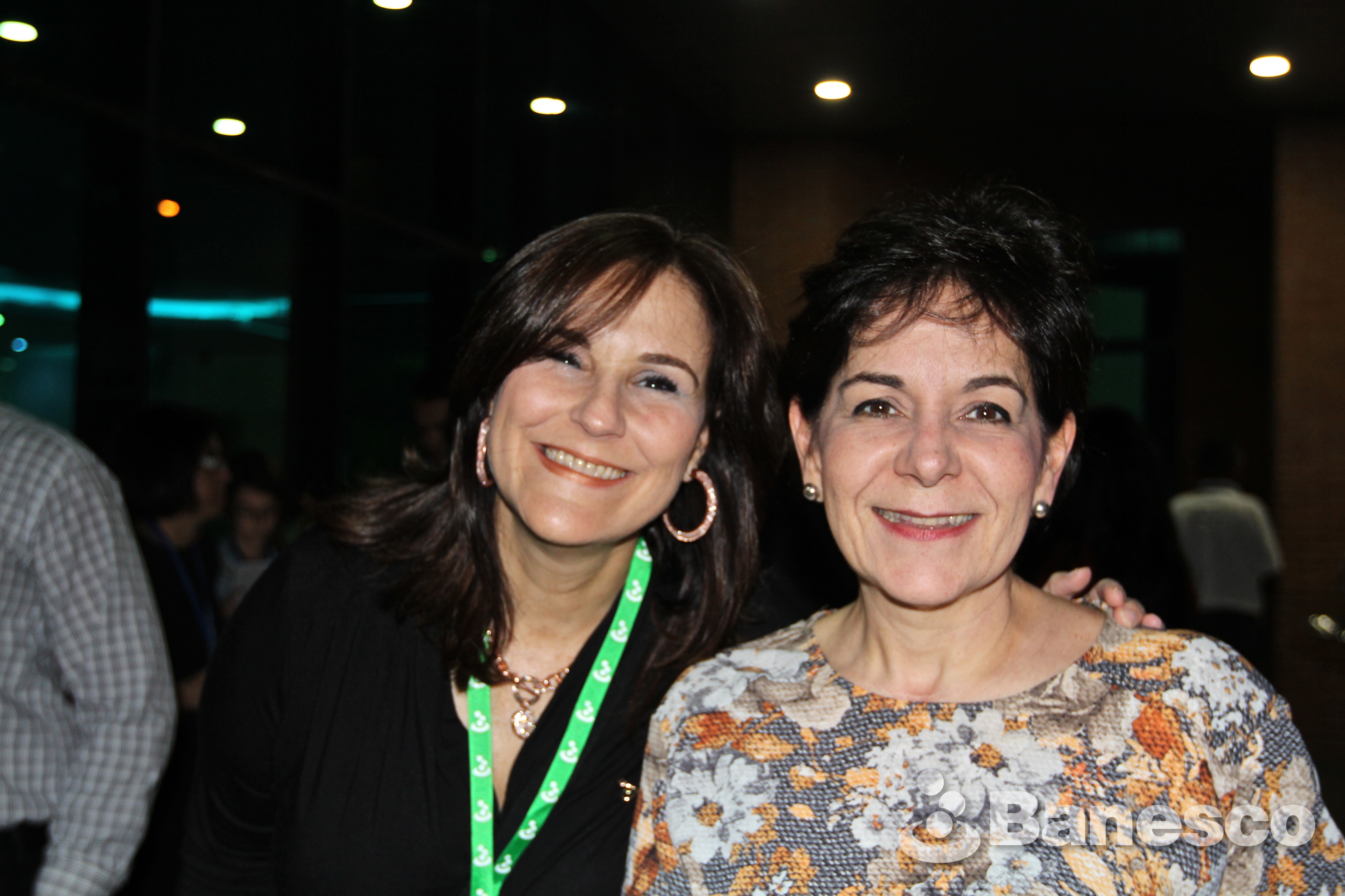 Paola Boccia y Rosamaria Atencio en la inauguración del mural Redes Cromáticas del artista plástico venezolano Emilio J. Narciso en la Torre Banesco II.