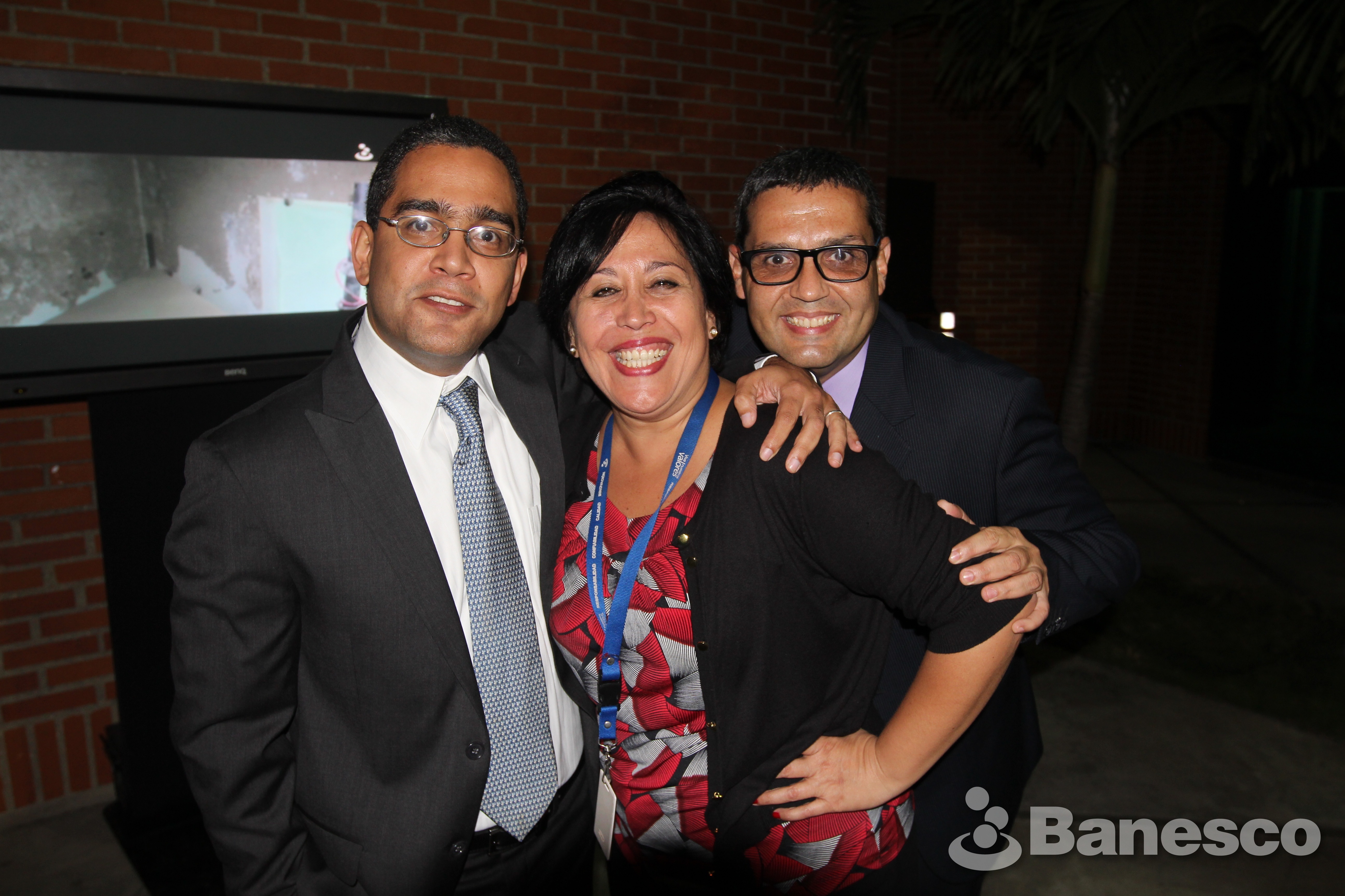 Norberto Méndez, Lorena Labarca y Jesús Escorche, pertenecientes a la VP de Comunicaciones y RSE de Banesco, cubriendo la inauguración del mural del artista plástico venezolano Emilio Narciso en la Torre Banesco II.