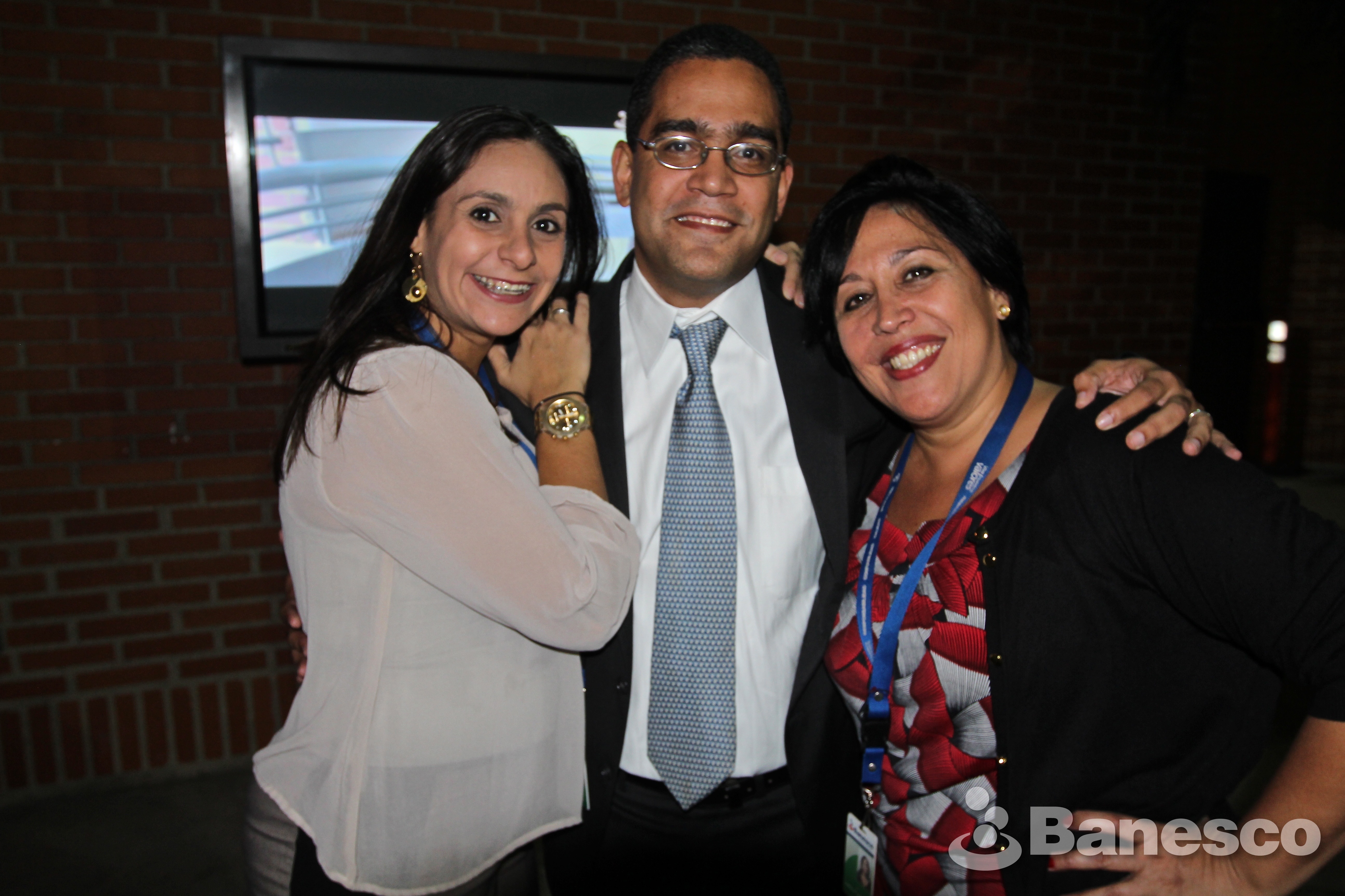 Bertha Vivas, Norberto Méndez y Lorena Labarca, pertenecientes a la VP de Comunicaciones y RSE de Banesco, cubriendo la inauguración del mural del artista plástico venezolano Emilio Narciso en la Torre Banesco II.