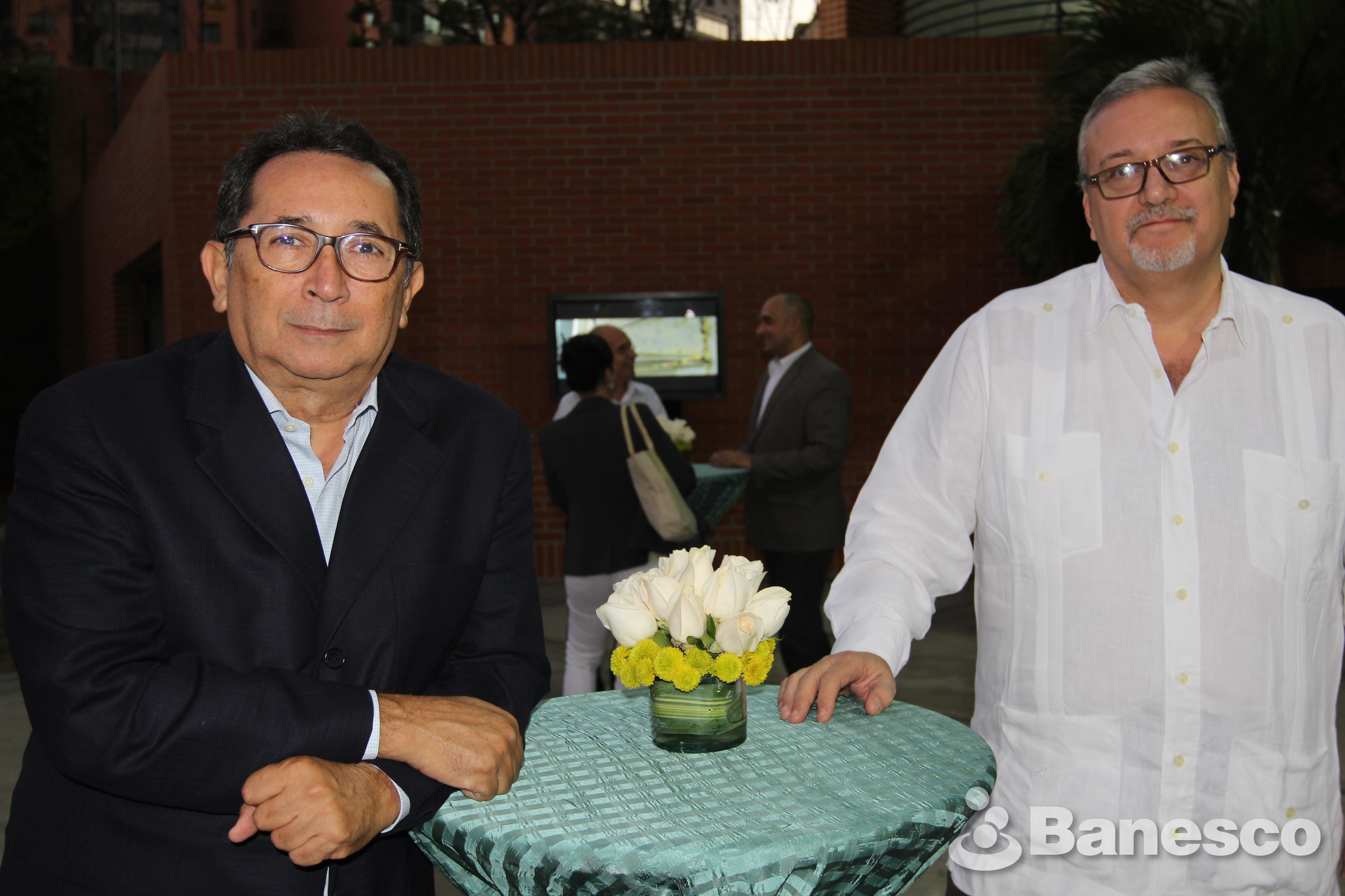 Francisco Zuniaga y Sergio Dahbar en la inauguración del mural Redes Cromáticas del artista plástico venezolano Emilio J. Narciso en la Torre Banesco II.