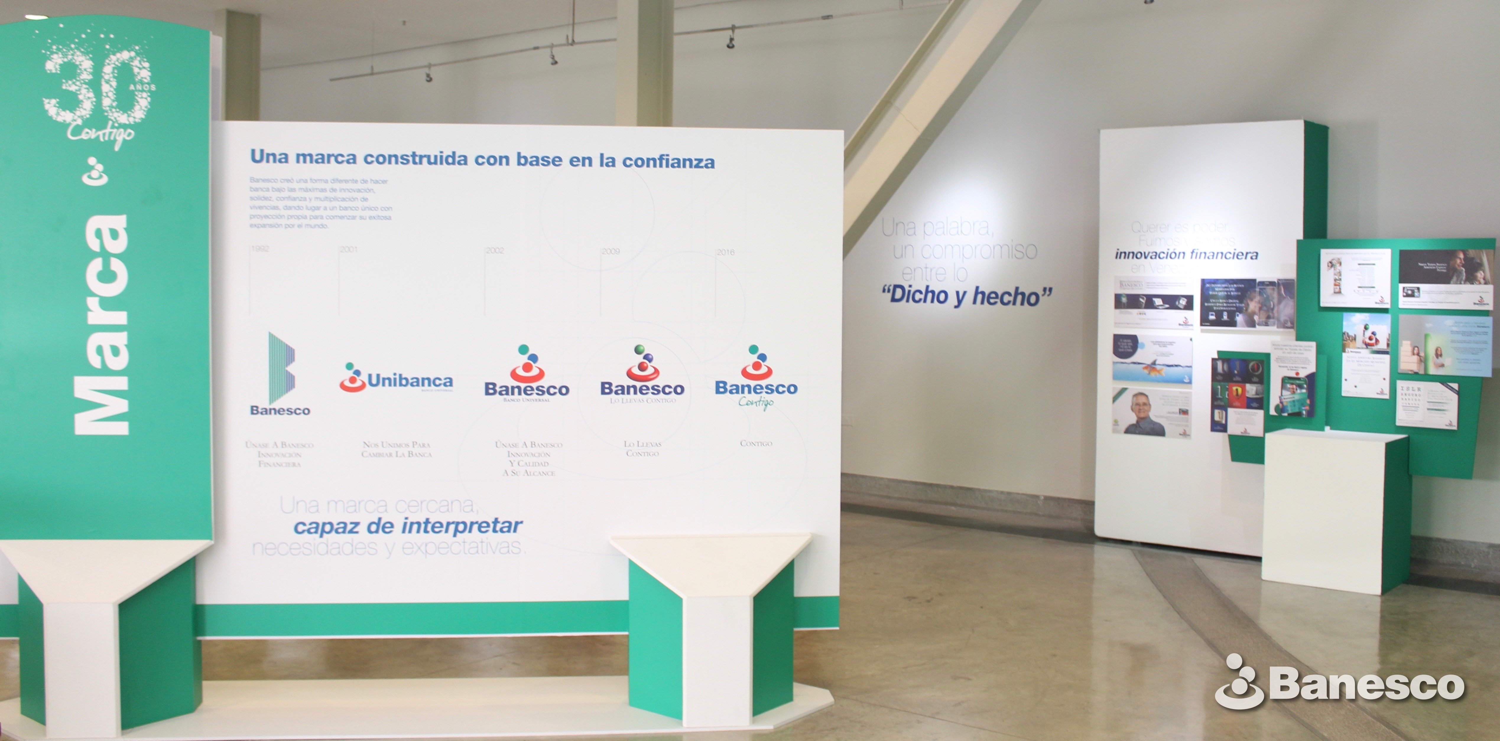 La exposición comienza con un recuento histórico de las fusiones y la creación de la marca, que va desde la adquisición de Bancentro en 1991 hasta la unión entre Banesco y Unibanca como Banesco Banco Universal en 2002.