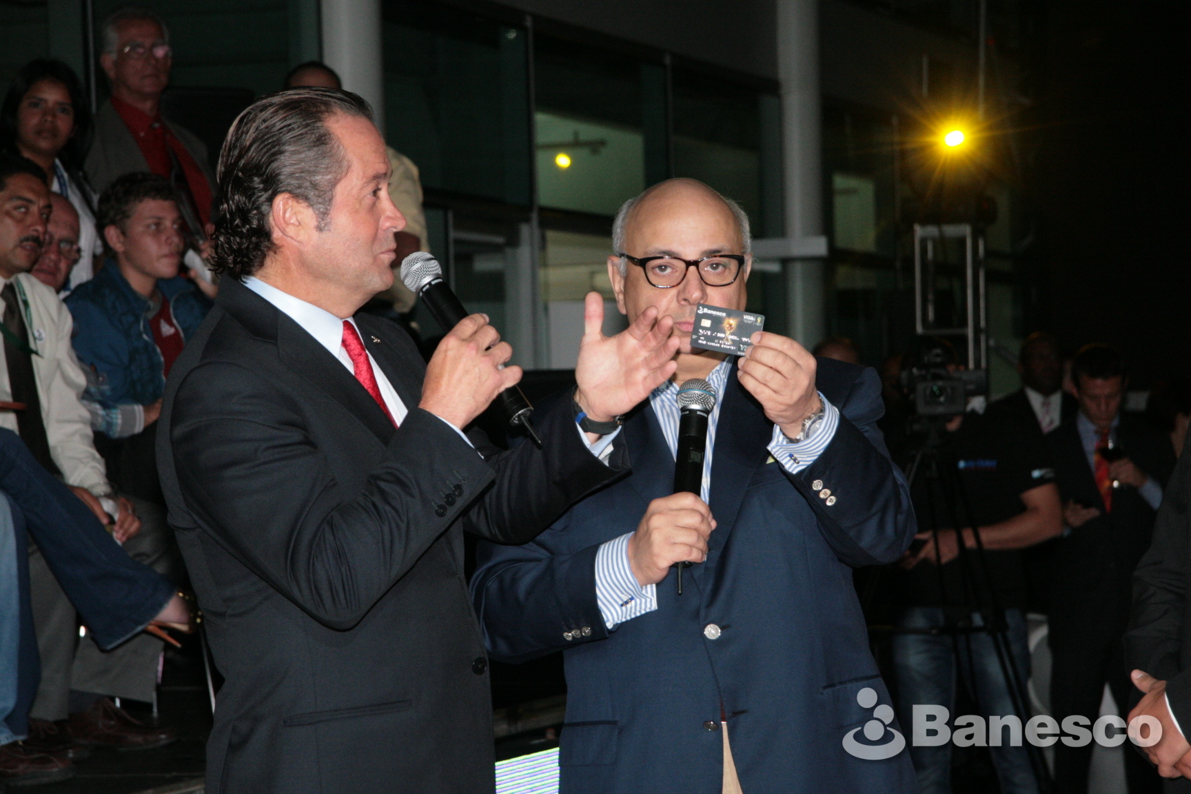 Juan Carlos Escotet y César Miguel Rondón muestran el plástico de la nueva tarjeta de crédito de Banesco, el cual cuenta con un atractivo diseño, sobre un fondo negro destacando la imagen de la Copa del Mundo. Todos los clientes de la entidad financiera podrán solicitar la tarjeta de la edición especial que celebra la máxima cita del fútbol que tendrá lugar en Brasil.