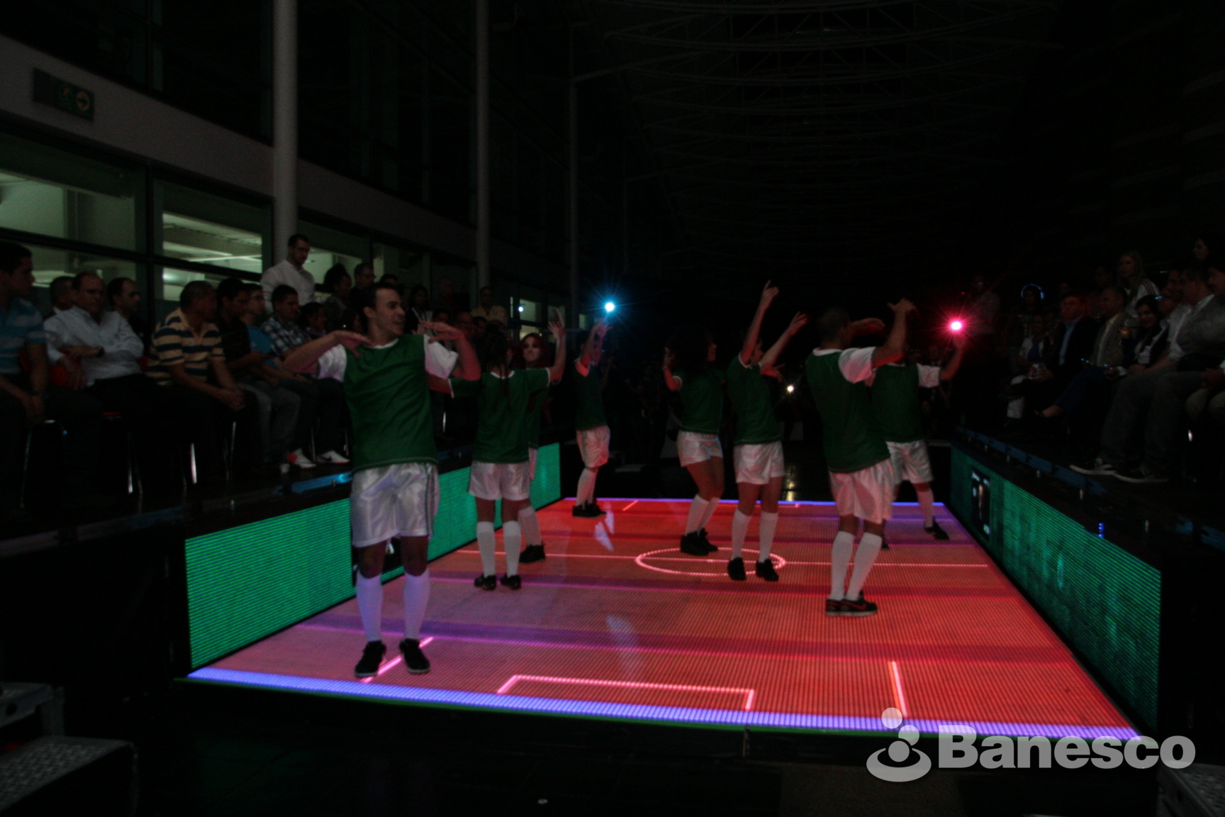 Espectáculo de luces con bailarines vestidos de fútbol, durante la presentación de la tarjeta de crédito de colección “Banesco VISA Copa Mundial de la FIFA 2014”, evento realizado en las instalaciones de Ciudad Banesco.