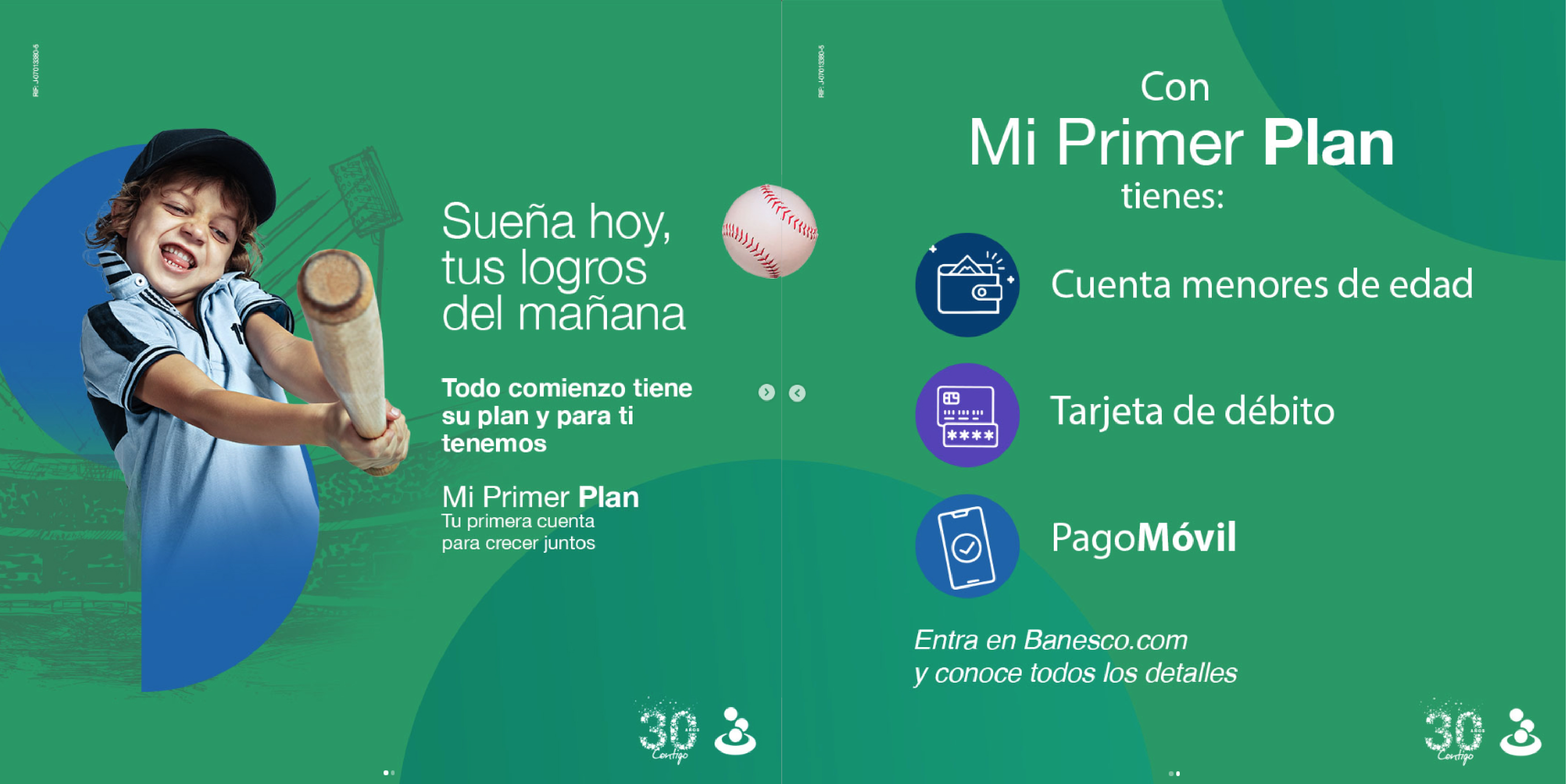 Todo lo que sueñas es posible con un buen primer plan. Te acompañamos en cada paso con tu primera: Cuenta de ahorro para Menores de Edad. Tarjeta de débito para hacer compras y pagos. Acceso fácil, rápido y seguro a BanescOnline y BanescoMóvil y PagoMóvil Con Mi Primer Plan también podrás Pagar o recargar el saldo del teléfono. Consultar el saldo de tu cuenta.