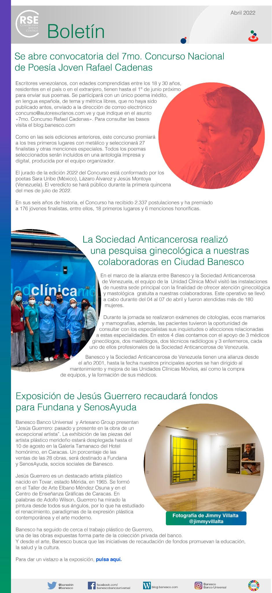 Contiene: Se abre convocatoria del 7mo. Concurso Nacional de Poesía Joven Rafael Cadenas / La Sociedad Anticancerosa realizó una pesquisa ginecológica a nuestras colaboradoras en Ciudad Banesco / Exposición de Jesús Guerrero recaudará fondos para Fundana y SenosAyuda