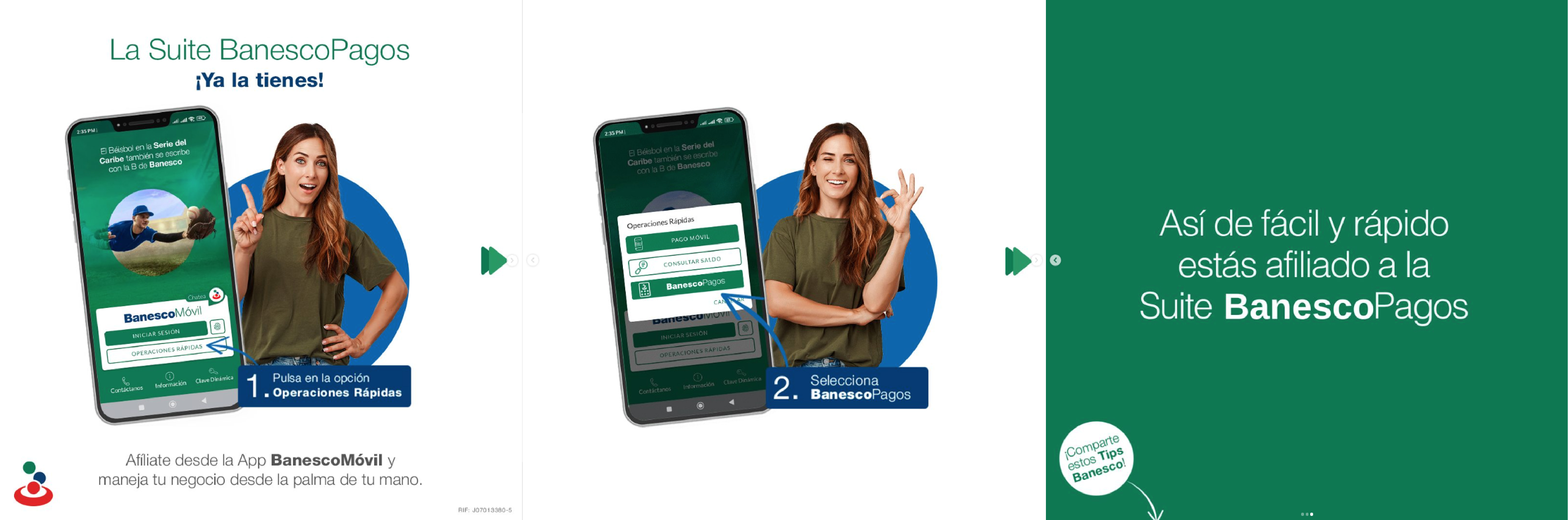 ¡Hey! Te mostramos lo fácil que es afiliarte a la Suite Banesco Pagos. Si eres Persona Jurídica, ve a tu app de siempre Banesco Móvil > Menú Operaciones Rápidas > Banesco Pagos y maneja tu negocio desde la palma de tu mano. Con la Suite podrás dar vuelto, validar tus pagos, y mucho más, ¡todo desde el celular!.