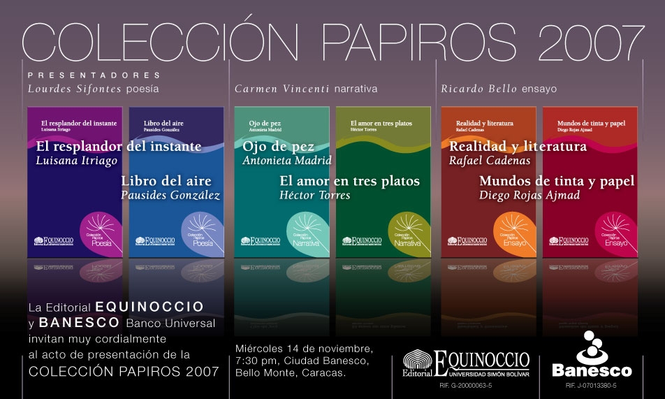 La Editorial EQUINOCCIO y BANESCO Banco Universal invitan muy cordialmente al acto de presentación de la Colección Papiros 2007.
