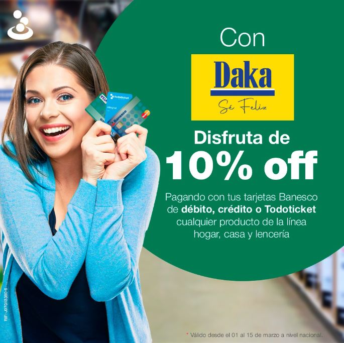 Paga con tus tarjetas de débito, crédito #Banesco y @todoticketvzla en @tiendasdaka y obtén 10 % de descuento en productos de las líneas Hogar (licuadoras, batidoras, planchas, tostiarepas), Casa (envases, utensilios, vajillas, ollas y sartenes) y Lencería (toallas, sábanas, edredones, alfombras y cortinas).