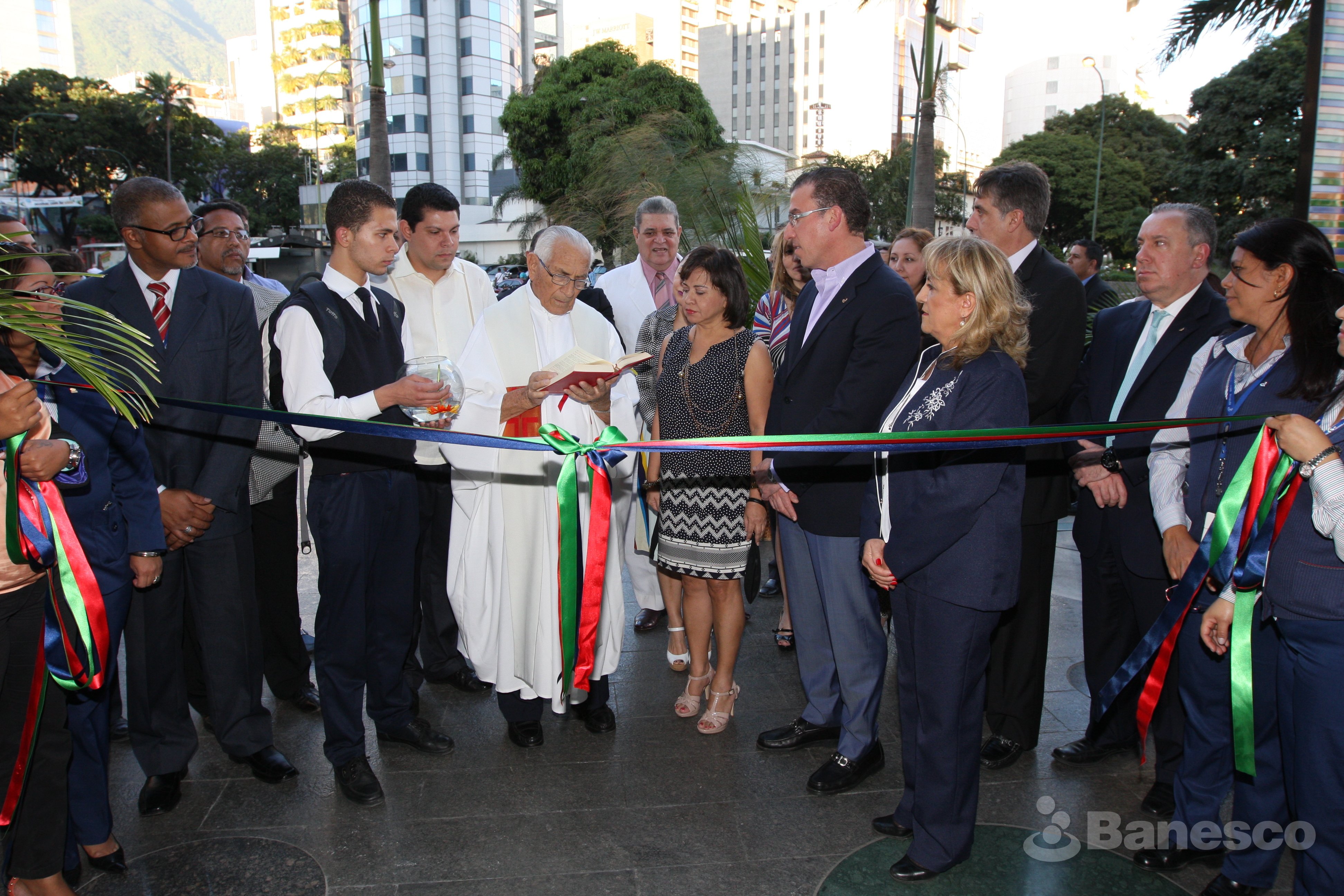 Representantes de Banesco escuchan atentamente las palabras del sacerdote Rino Bergamin al momento de realizar la misa y bendecir la nueva agencia de la entidad financiera.