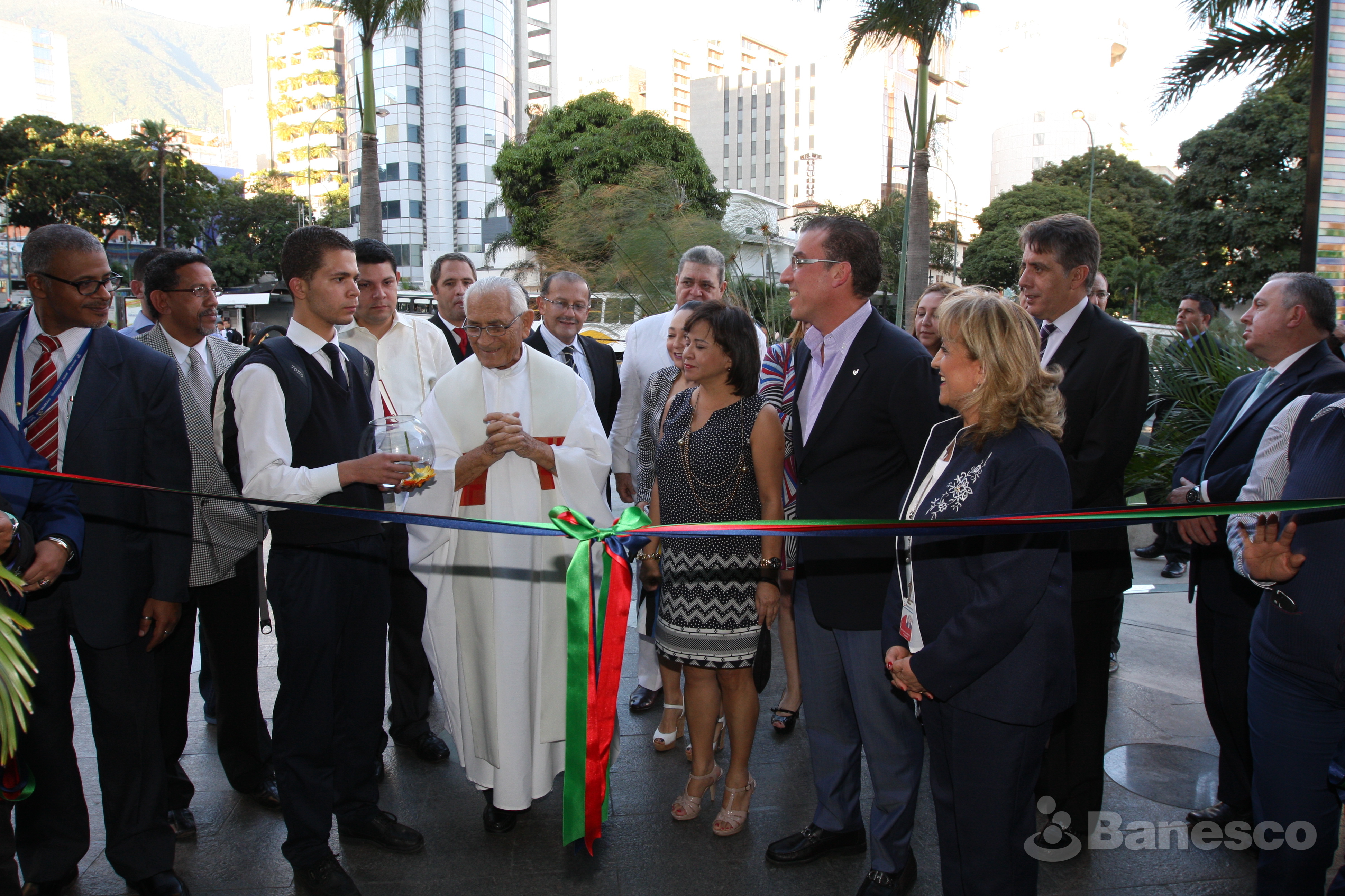 Representantes de Banesco junto a sus colaboradores realizan el corte de cinta para inaugurar la nueva agencia de la institución bancaria.