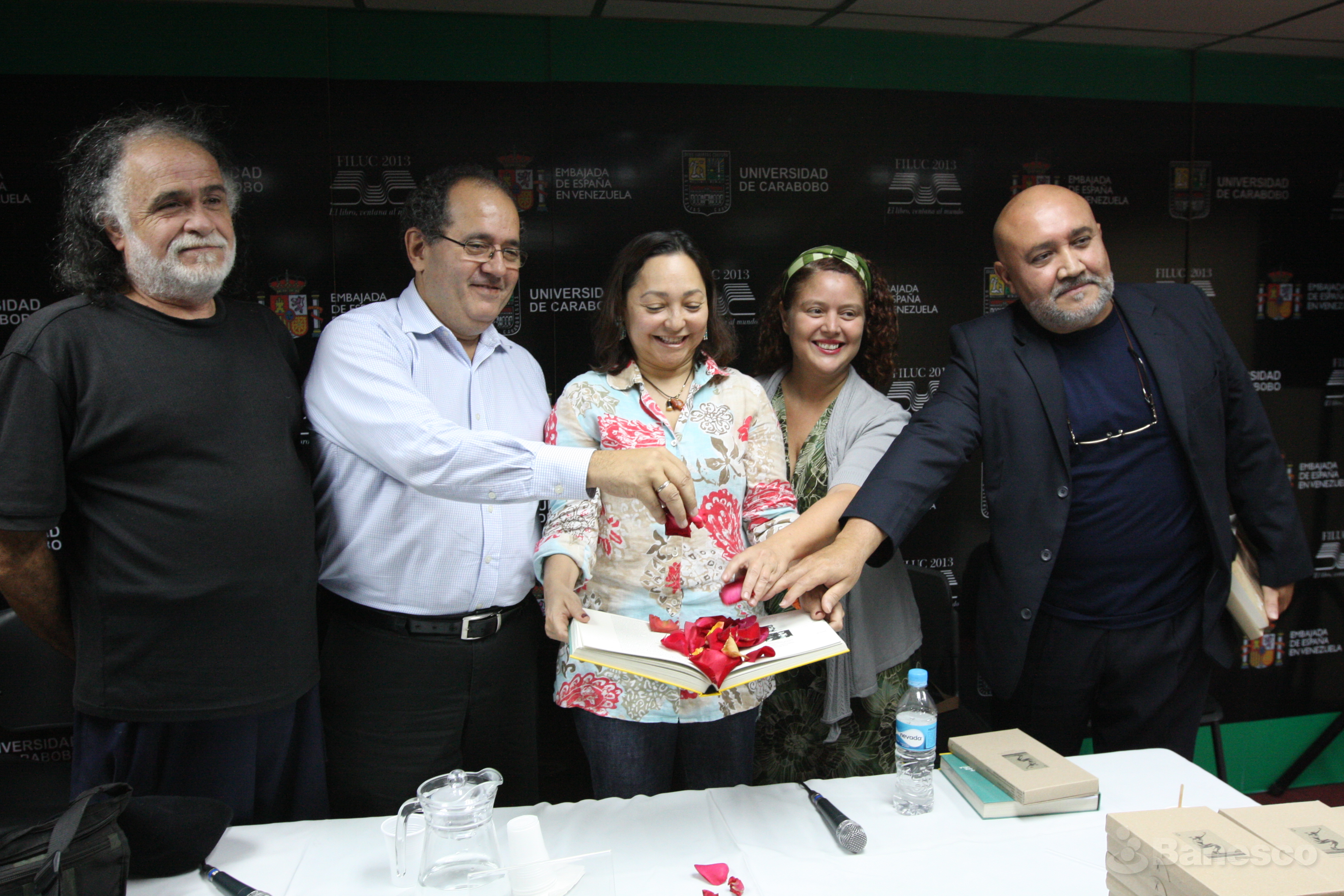 Harry Almela, Antonio López Ortega, Mariela Colmenares, Marianela Maldonado y Rafael Simón Hurtado durante el bautizo del libro "Gente que hace escuela", evento realizado en el marco de la edición 2013 de la Feria Internacional del Libro de la Universidad de Carabobo (Filuc).