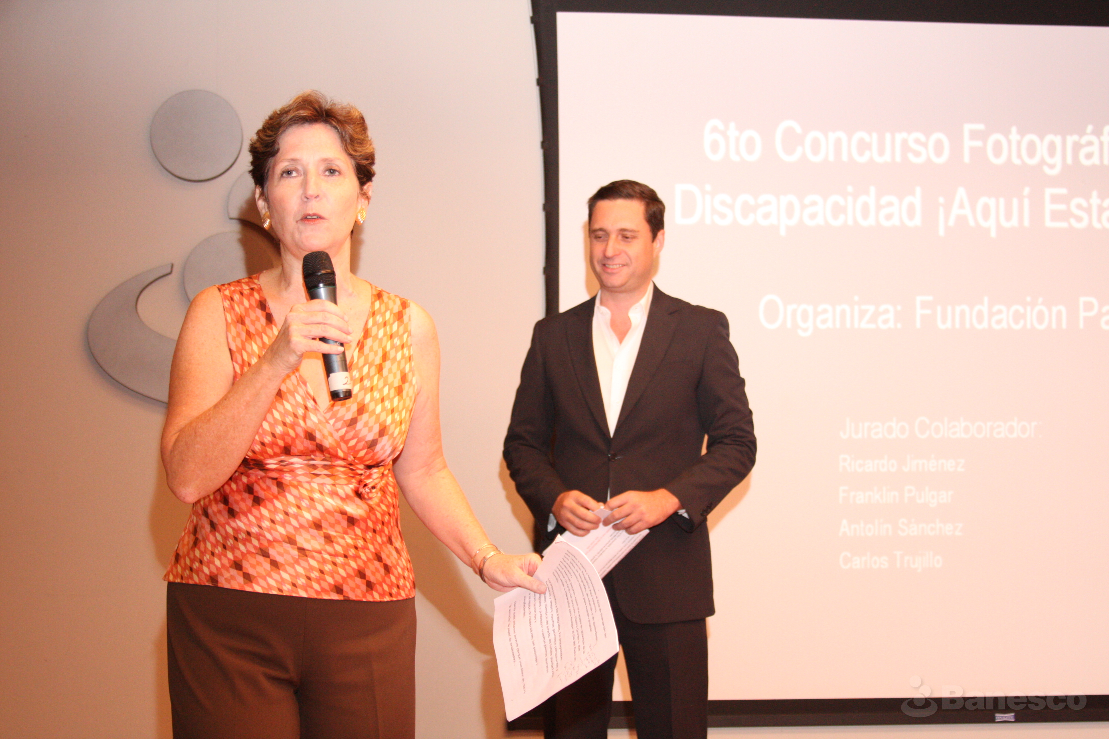 Angela Couret representante de la Fundación Paso a Paso junto a José Manuel Dopazo presentador del evento, durante la entrega de premios del Concurso Fotográfico sobre Personas con Discapacidad ¡Aquí Estamos 2011!.