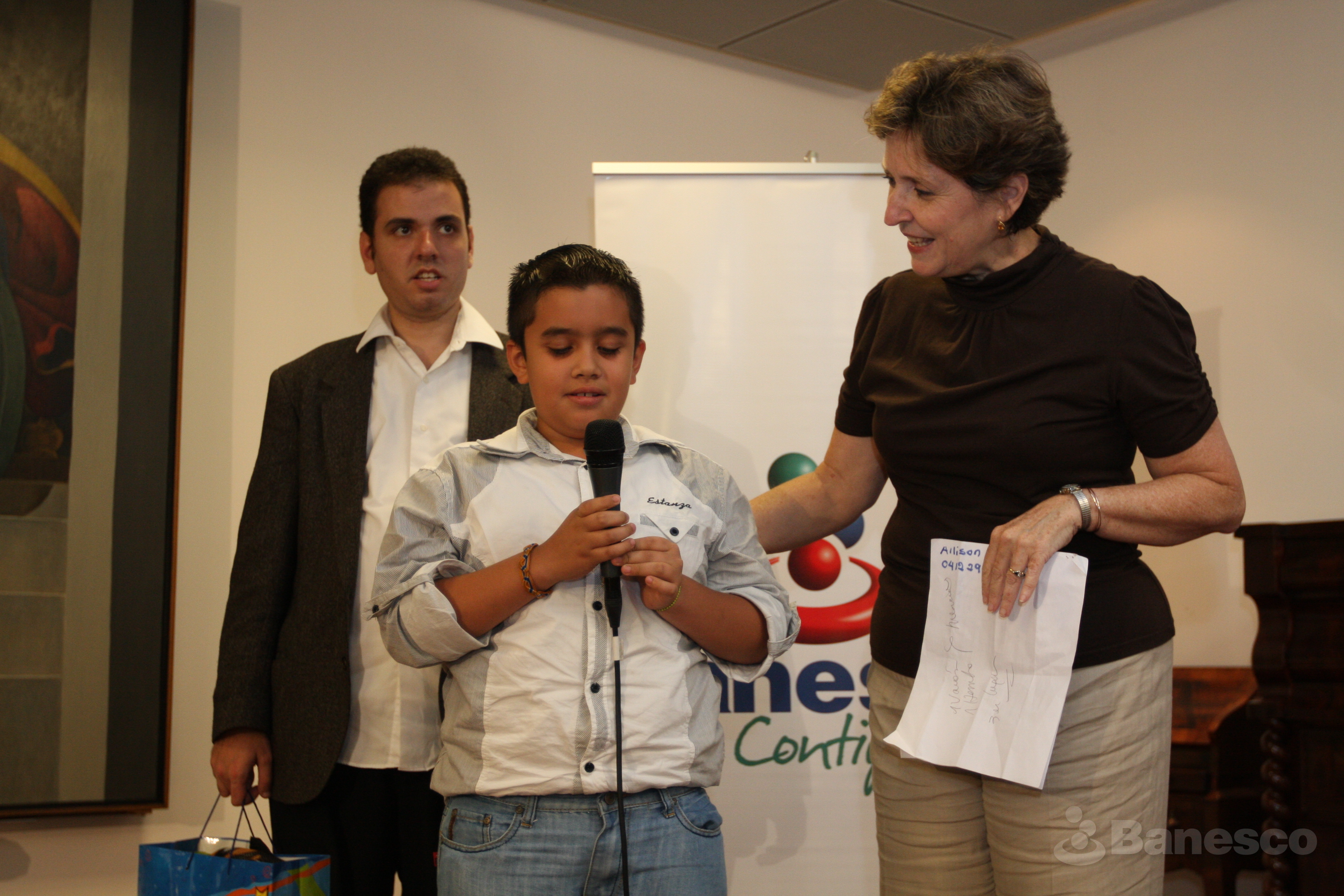 Participante del concurso de dibujo "Una escuela para todos" durante la entrega de obsequio por parte de Angela Couret directora de la Fundación Paso a Paso, en el evento realizado en los espacios de Ciudad Banesco.