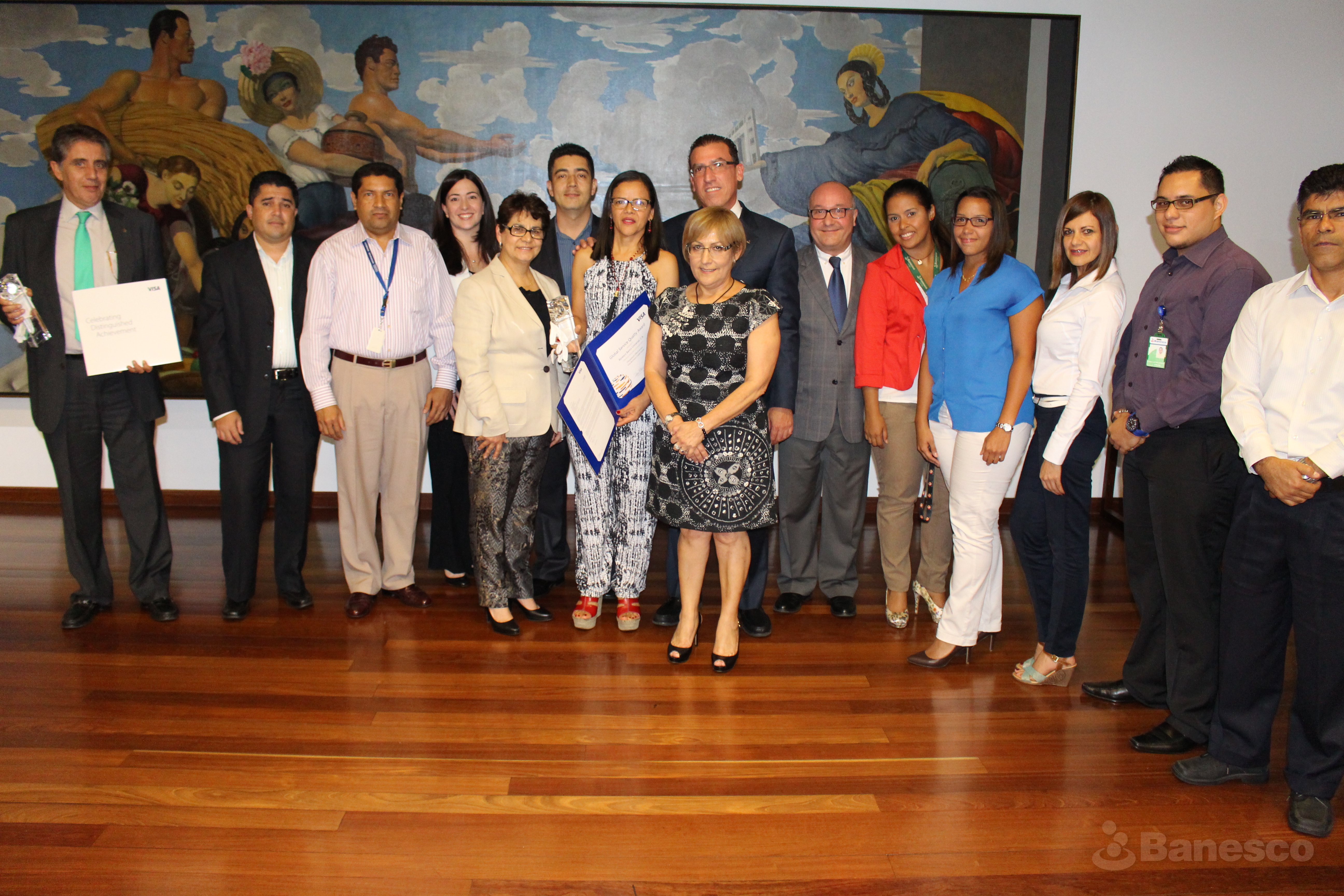 Representantes de Visa y Banesco posterior al evento de entrega de reconocimiento al Desempeño en la Calidad de Servicio.
