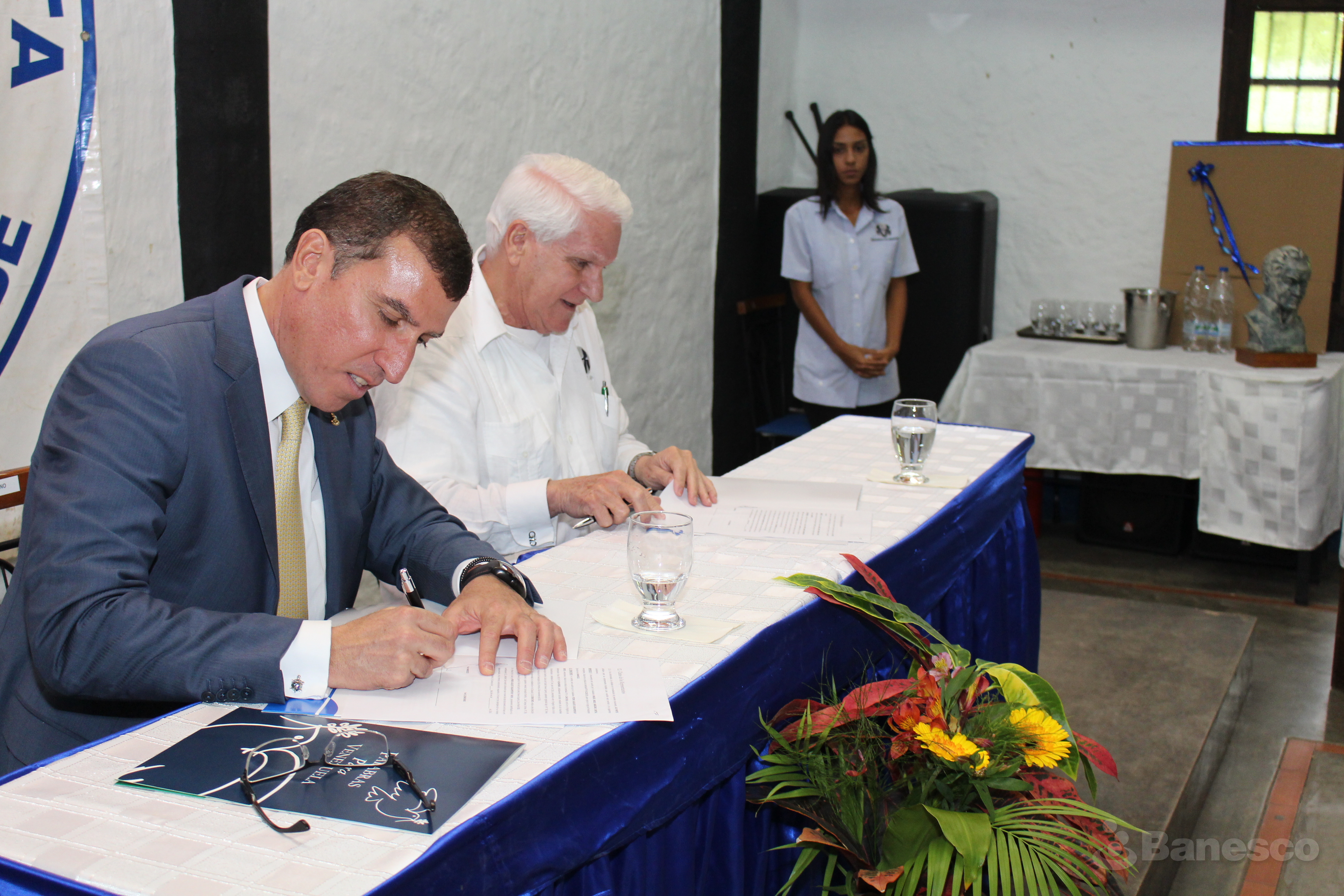 Ffirma del convenio entre la entidad bancaria y la casa de estudios neoespartana. El acto estuvo encabezado por Miguel Ángel Marcano, presidente ejecutivo de Banesco, y Pedro Beauperthuy, rector de UNIMAR.