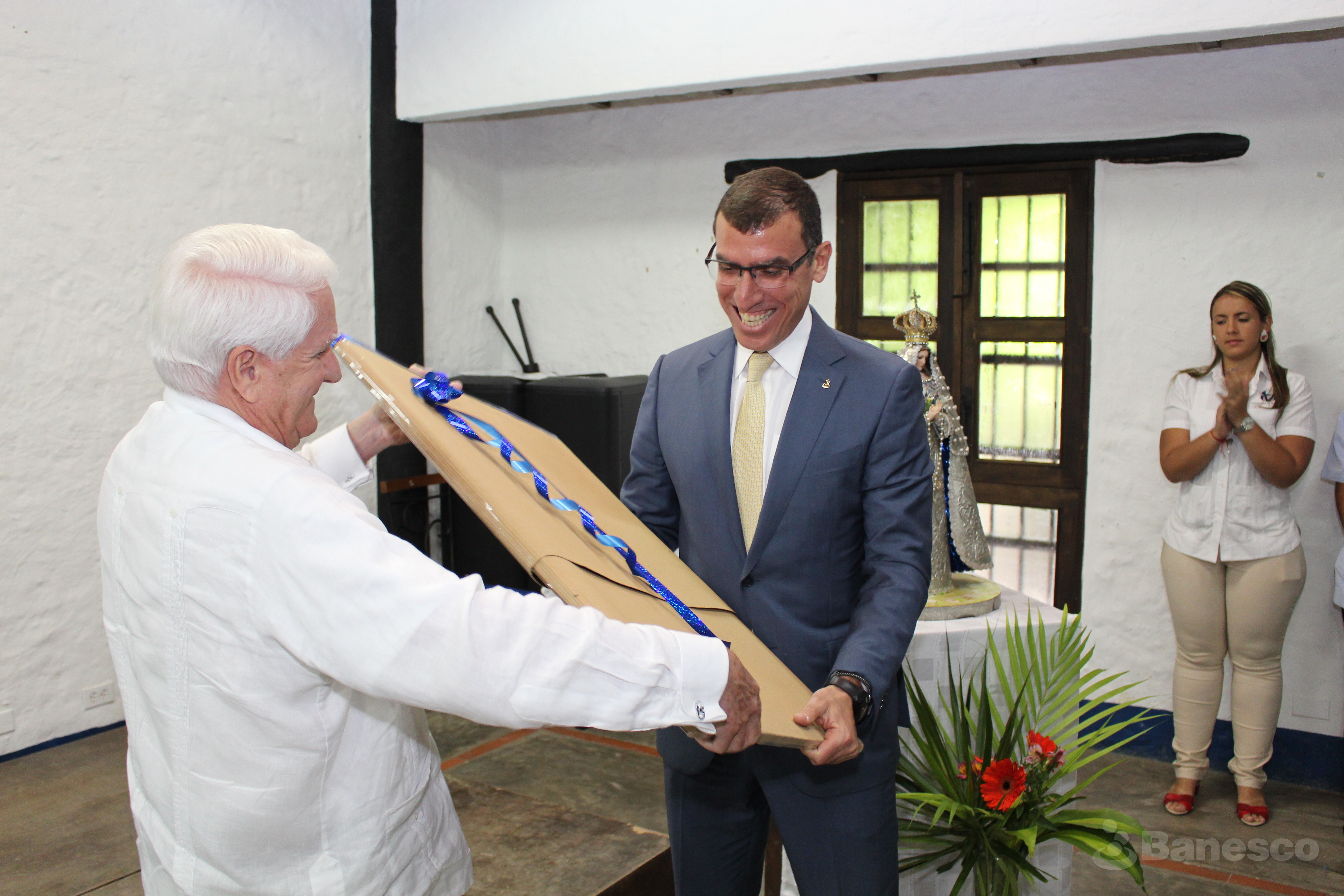 Pedro Beauperthuy, rector de la Universidad de Margarita (UNIMAR), entrega a Miguel Ángel Marcano, presidente ejecutivo de Banesco, obsequio como gesto de agradecimiento.