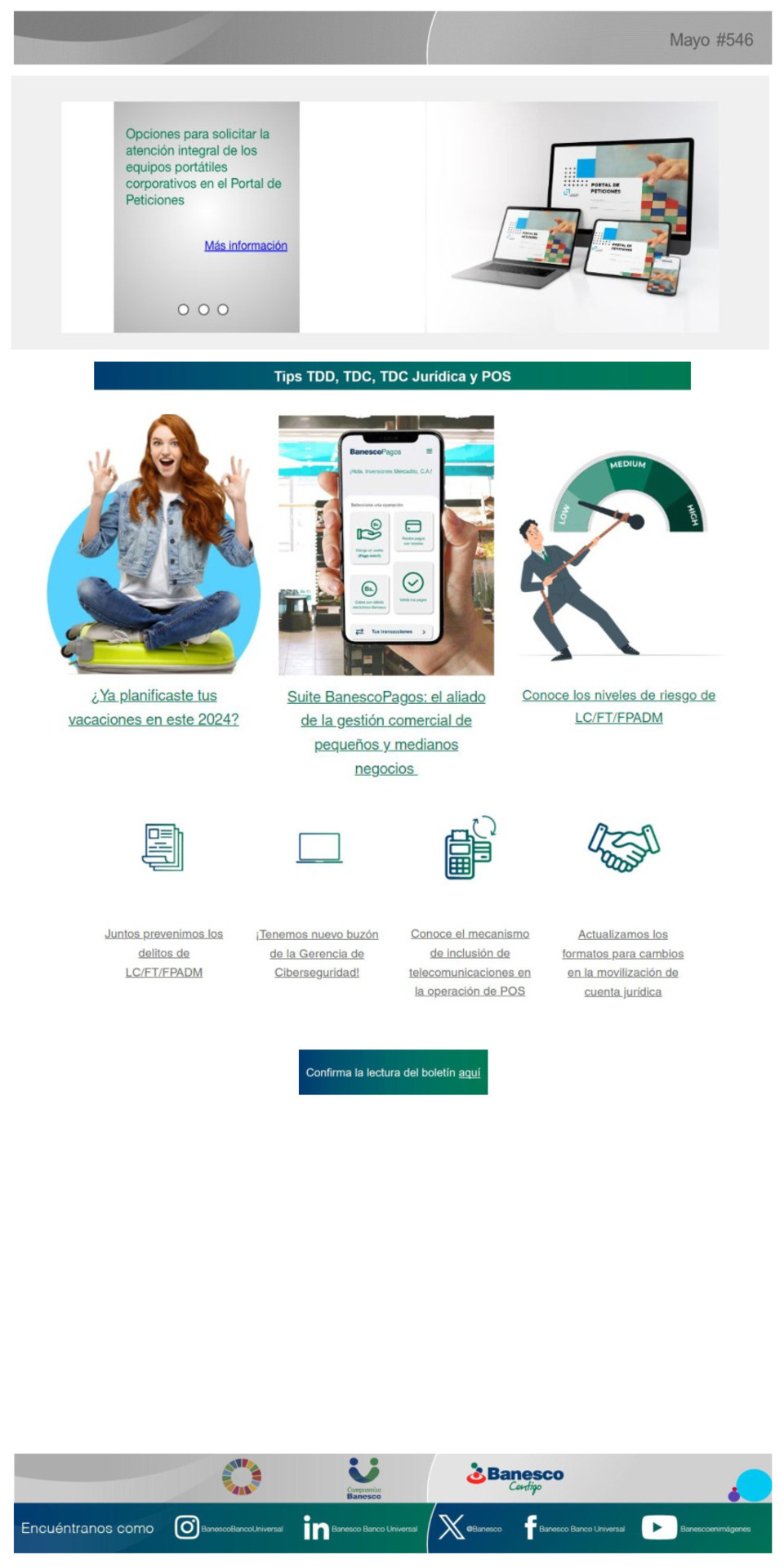 El Boletín de Agencias 546 contiene la siguiente información: Juntos prevenimos los delitos de LC/FT/FPADM / ¿Ya planificaste tus vacaciones en este 2024? / Conoce el mecanismo de inclusión de telecomunicaciones en la operación de POS / ¿Te gustaría optimizar tu efectividad sin sumergirte en interminables reuniones? / BanescoPagos / Actualizamos los formatos para cambios en la movilización de la Cuenta Persona Jurídica / Conoce los niveles de riesgo de LC/FT/FPADM / ¡Tenemos nuevo buzón de la Gerencia Ciberseguridad! / Opciones para solicitar la atención integral de los equipos portátiles corporativos en el Portal de Peticiones / Impulsemos la aceptación de las tarjetas Todoticket / Tips TDD / Te recordamos las consideraciones para la actualización de la gestión de Expedientes para Cliente Alto Riesgo.