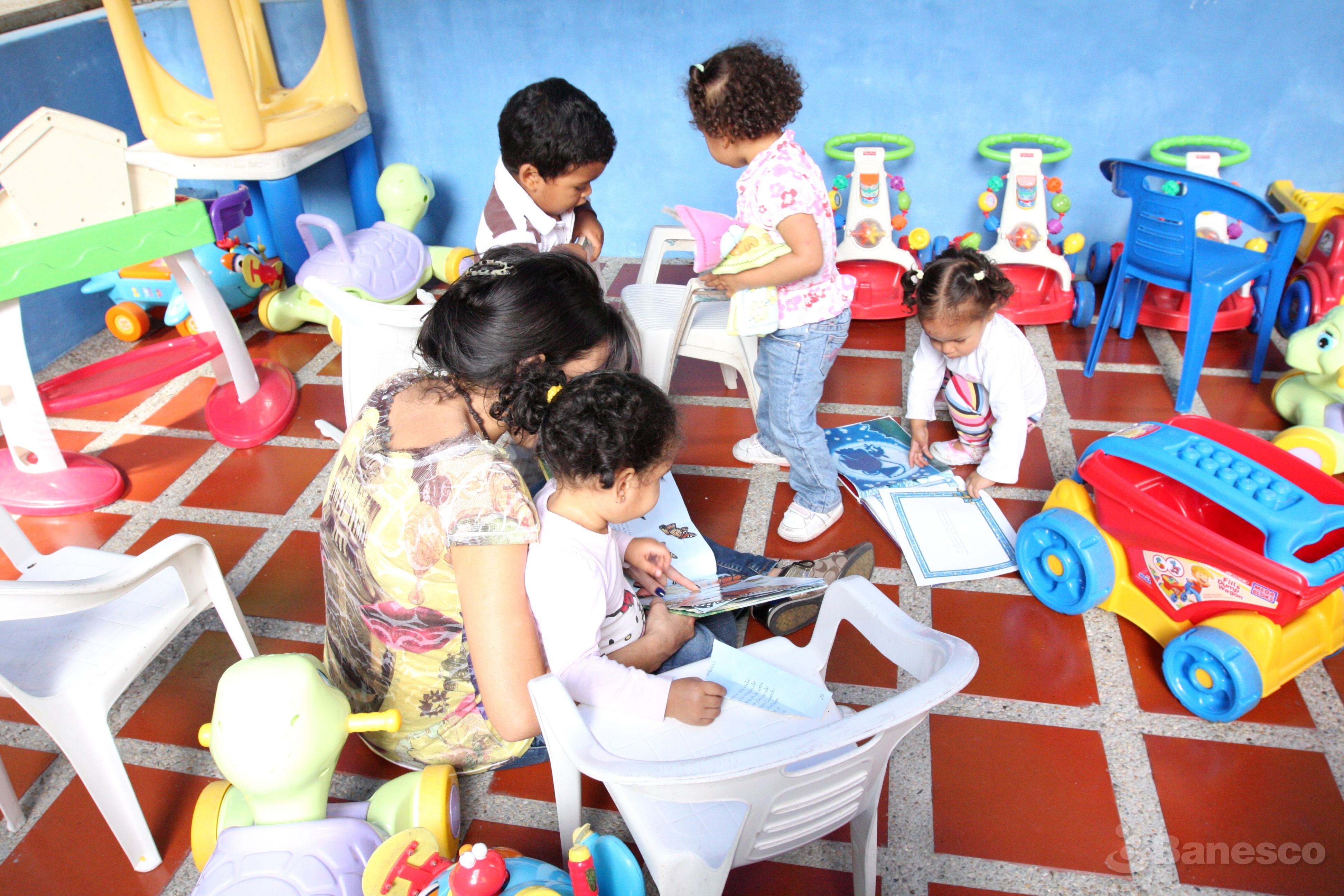 Voluntaria Banesco leyendo un cuento a los niños el día de la entrega de regalos en la Fundación Amigos del Niño que Amerita Protección (Fundana) en celebración a las fiestas decembrinas.
