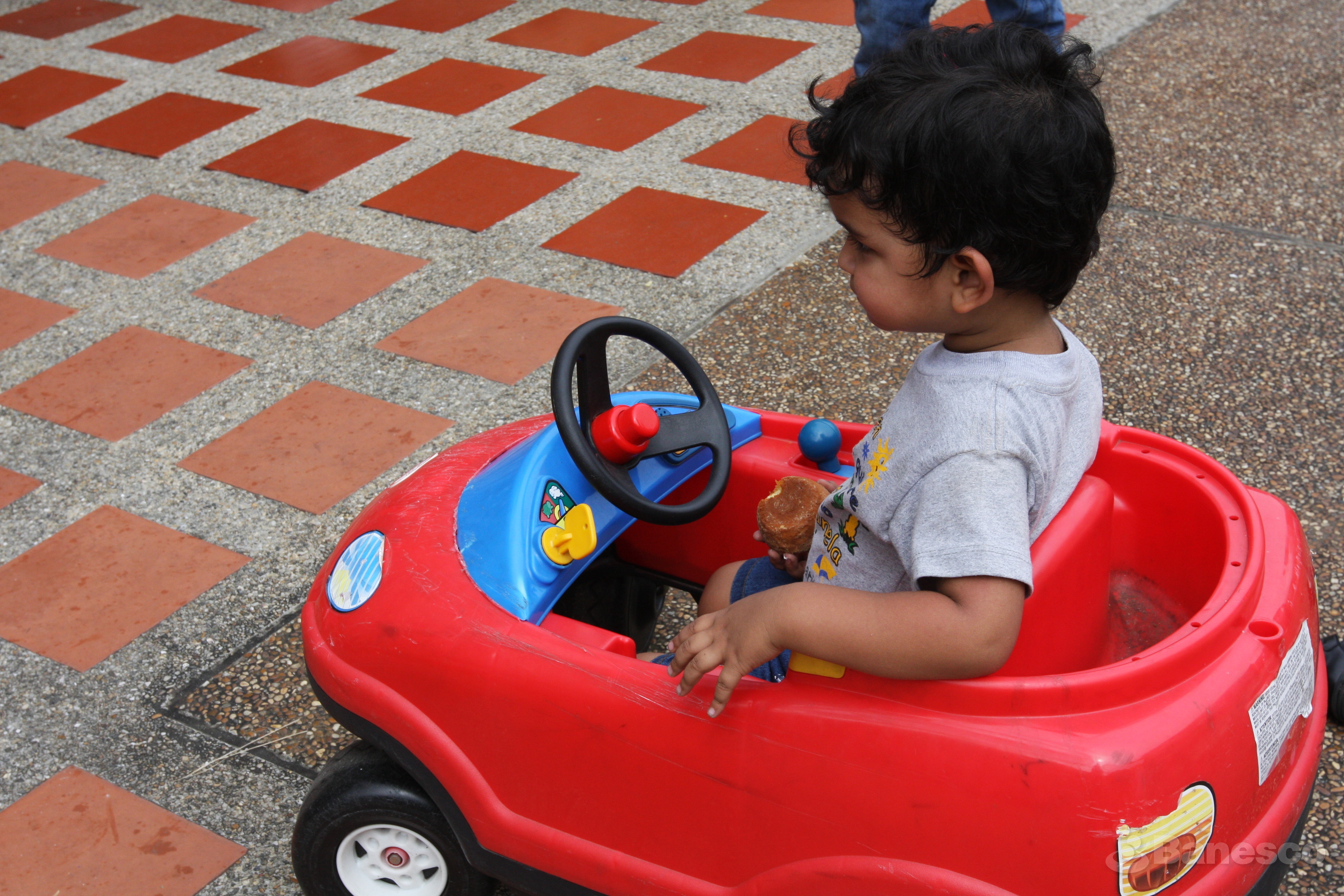 Niño de FUNDANA jugando con un carrito entregado por el Voluntariado Banesco durante el evento de entrega de regalos para festejar la llegada de las fiestas decembrinas.