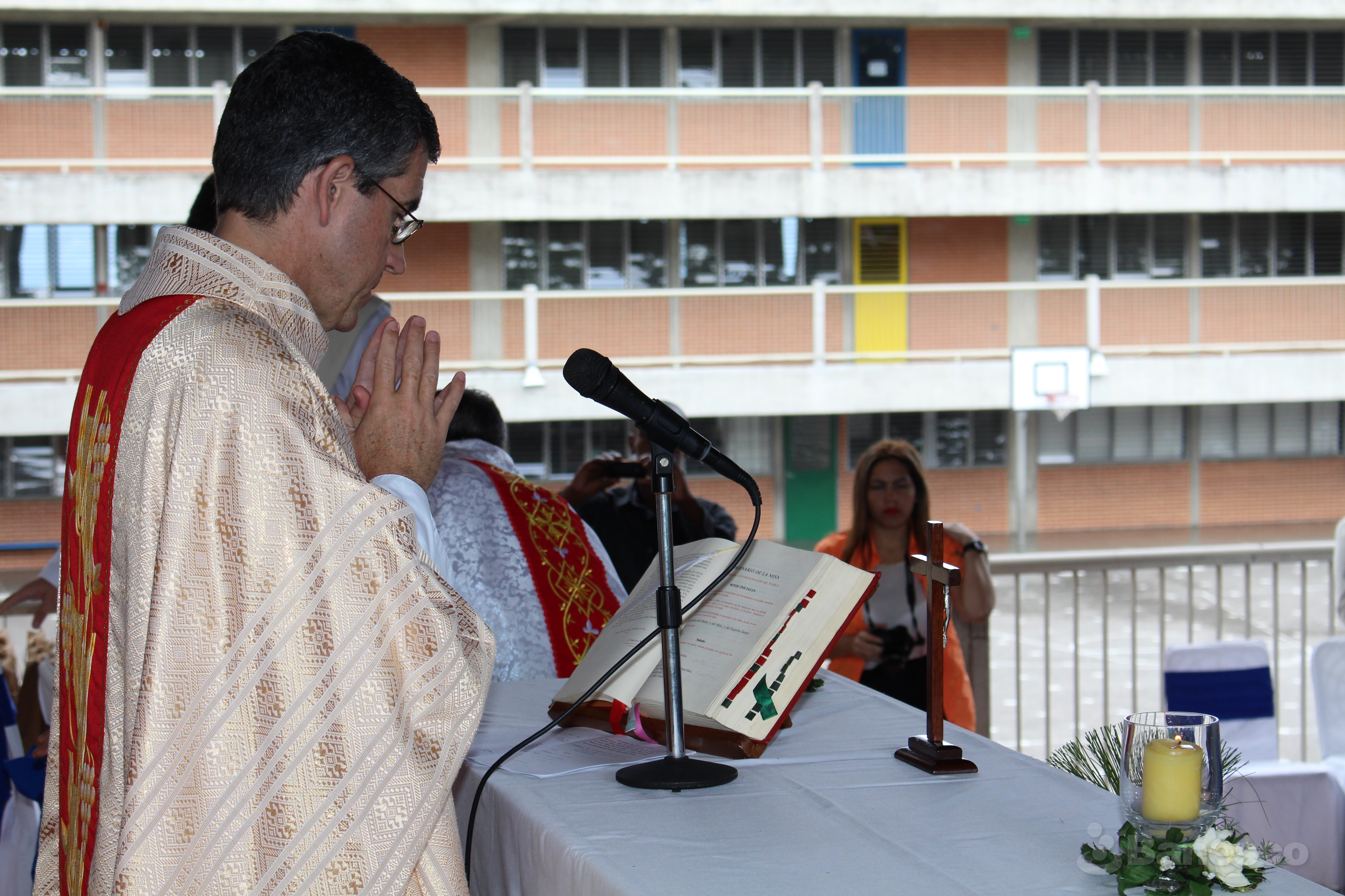 Sacerdote hace oración para iniciar con la misa realizada antes de la entrega de certificados de los 66 bachilleres que pertenecen a la XIII promoción del Colegio Mano Amiga y forman parte del Plan Padrino TodoTicket Venezuela, a través del cual la organización beneficia a jóvenes de escasos recursos con el pago de la matrícula escolar y con la realización de actividades que fomentan valores.