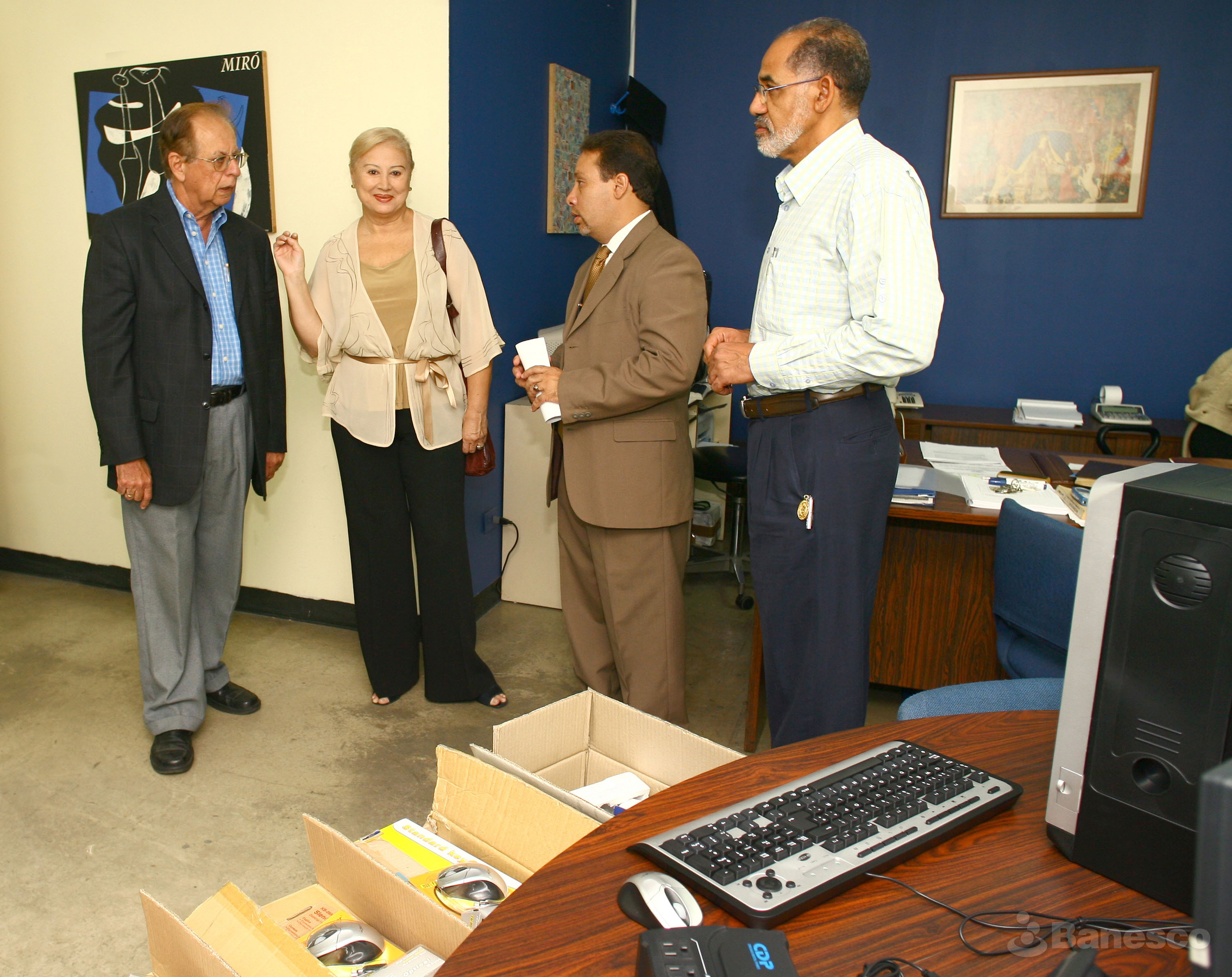 Representante de Banesco junto a personal docente y administrativo de la Universidad Central de Venezuela durante la entrega de cinco (5) computadoras nuevas para la Escuela de Administración y Contaduría, como parte del programa de Responsabilidad Social Empresarial de la institución financiera.