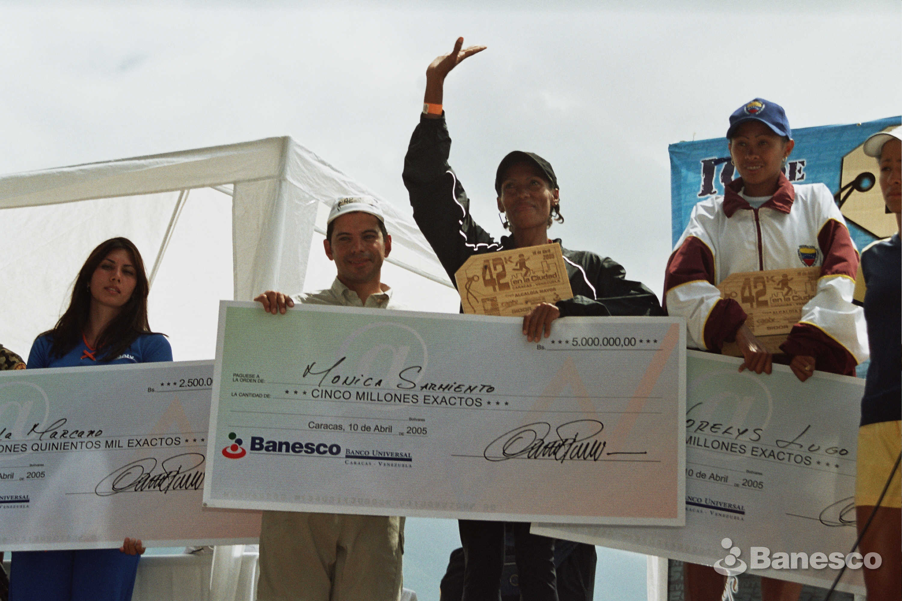 Atleta Mónica Sarmiento recibiendo cheque por su participación en el Maratón 42k en la Ciudad, de la Copa Alcadía Mayor.