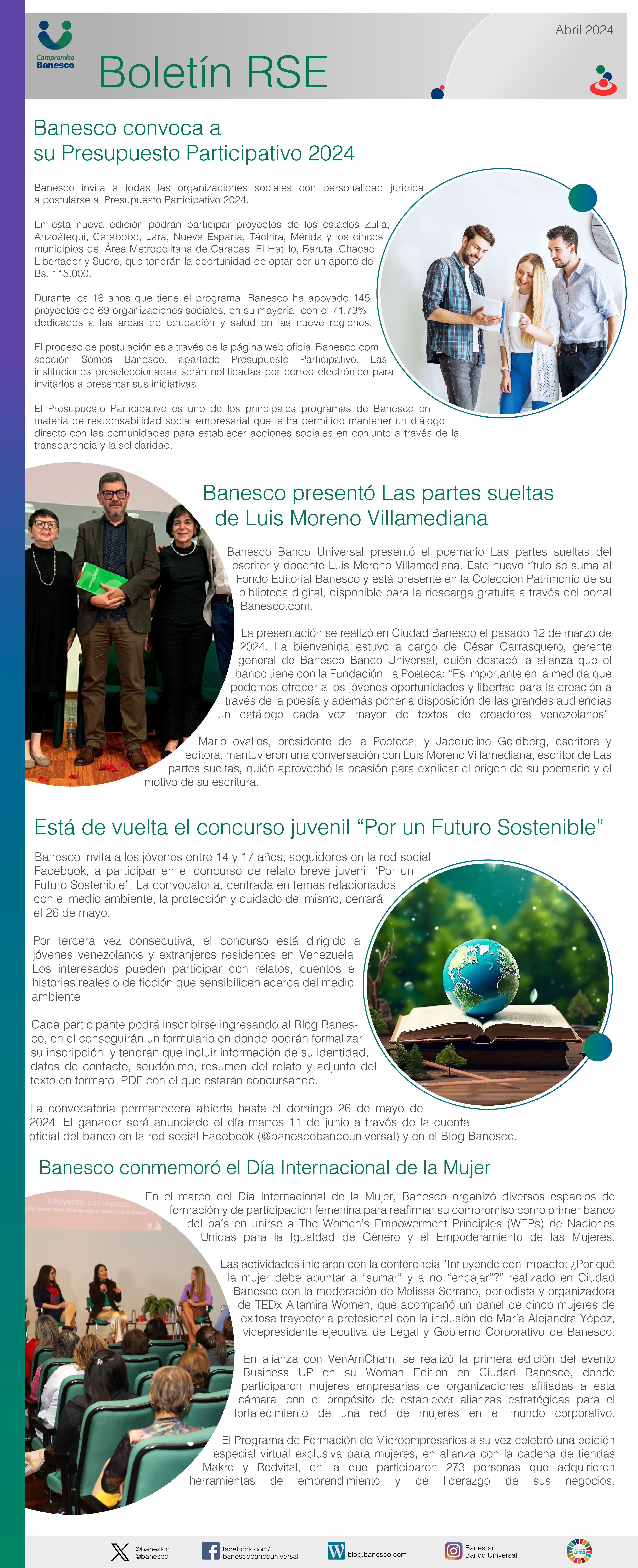 Contiene: Banesco convoca a su Presupuesto Participativo 2024 / Banesco presentó Las partes sueltas de Luis Moreno Villamediana / Está de vuelta el concurso juvenil "Por un Futuro Sostenible" / Banesco conmemoró el Día Internacional de la Mujer.