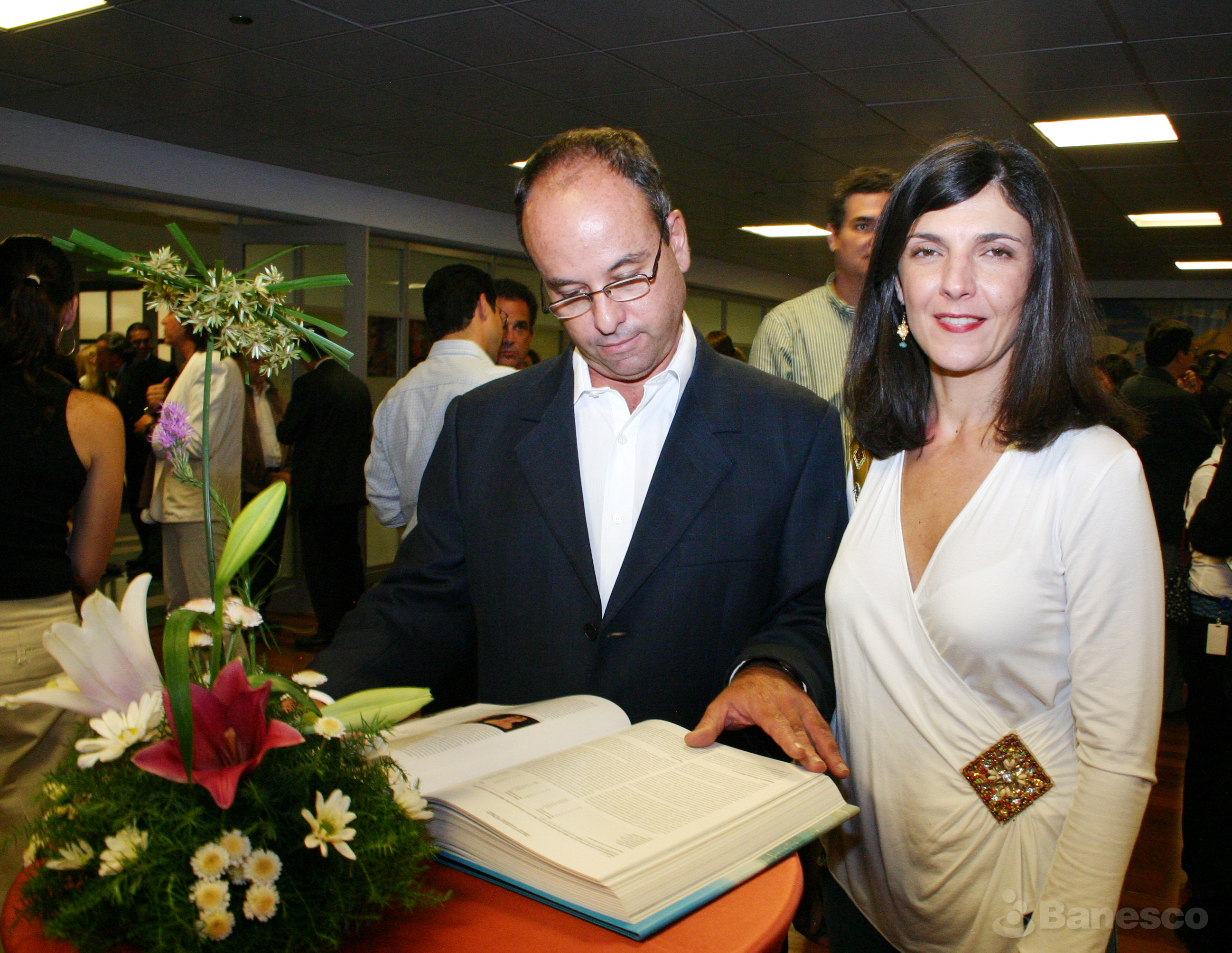 Humberto Ramírez observando el libro "Ídolos de las Islas Prometidas", durante el bautizo realizado en las instalaciones de Ciudad Banesco.
