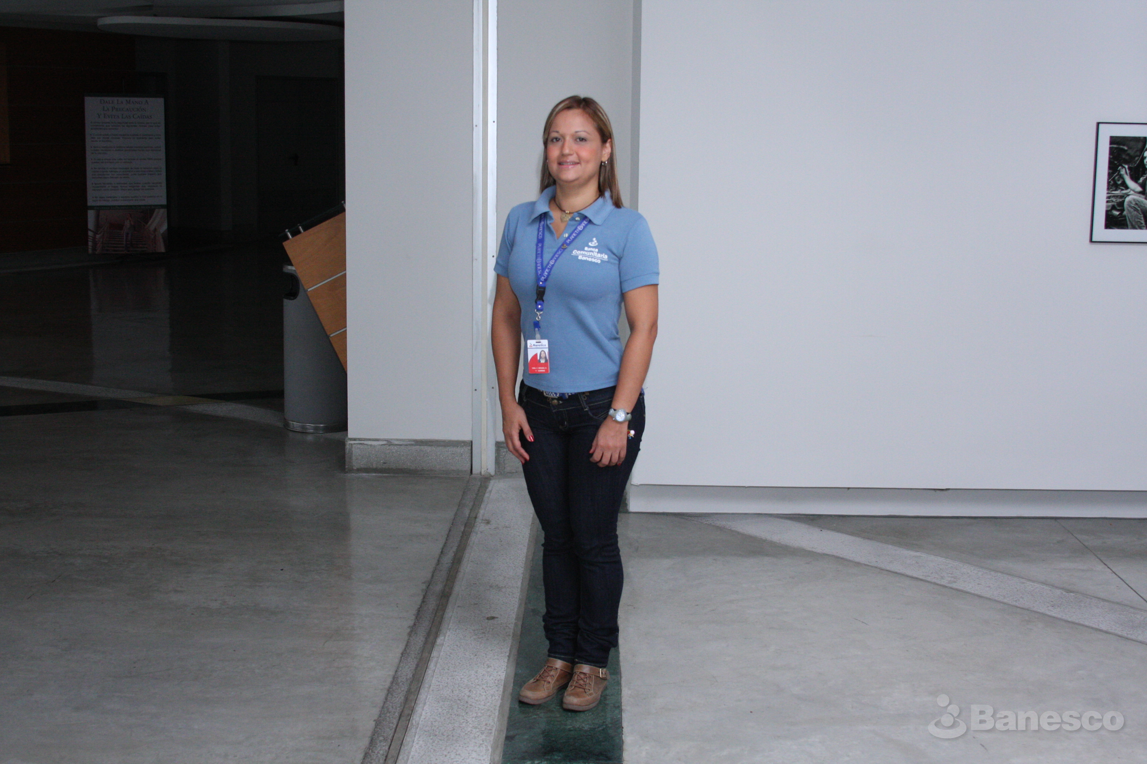 Ciudadana Banesco utilizando una camisa de la Banca Comunitaria de Banesco en color azul.