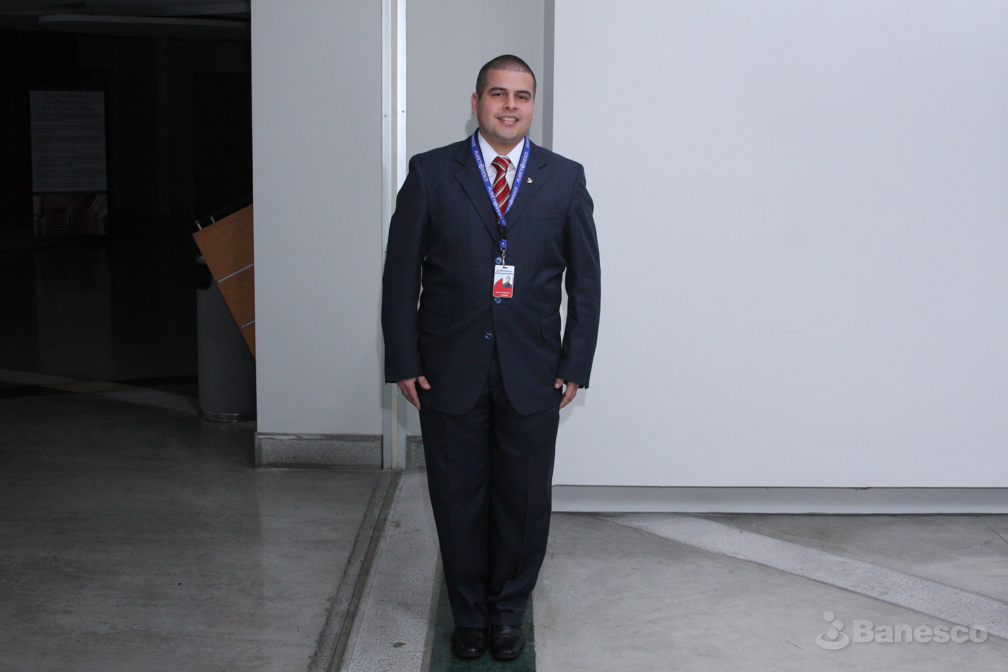 Vestimenta formal ejecutiva para caballero, conformada por una camisa en color blanco, traje (pantalón y saco) de color azul marino y una corbata roja con rayas grises y blancas.