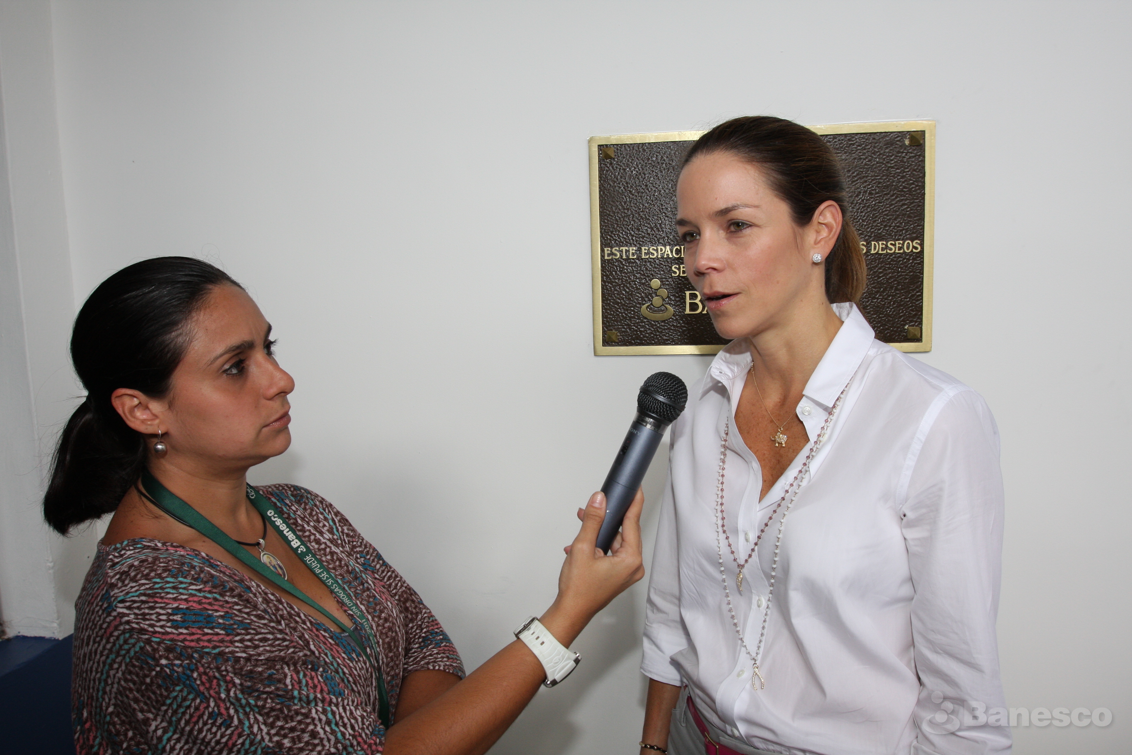Bertha Vivas de la Vp. de Comunicaciones de Banesco, entrevista a Andreína Vogeler Mendoza de Pérez, directora ejecutiva de La Fundación Venezolana contra la Parálisis Infantil (FVCLPI) durante la inauguración de la sala de espera del Hospital Ortopédico Infantil de Caracas.