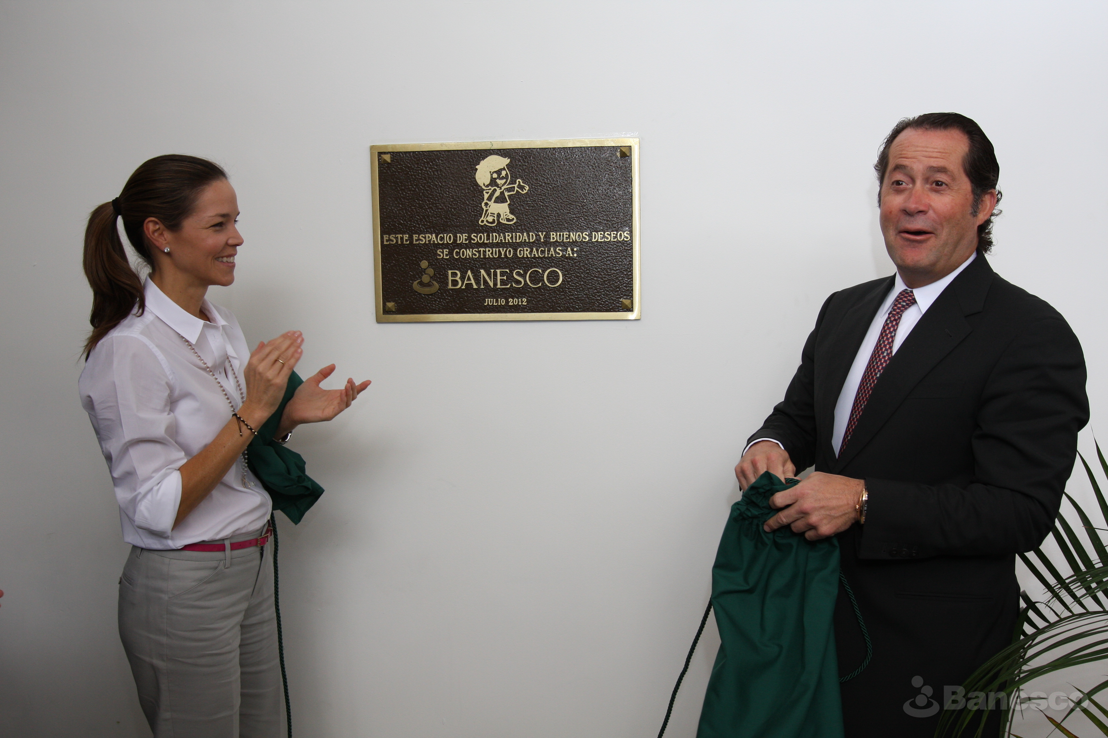 Andreína Vogeler y Juan Carlos Escotet exhibiendo la placa para dar inicio a la inauguración de la sala de espera del Hospital Ortopédico Infantil de Caracas.