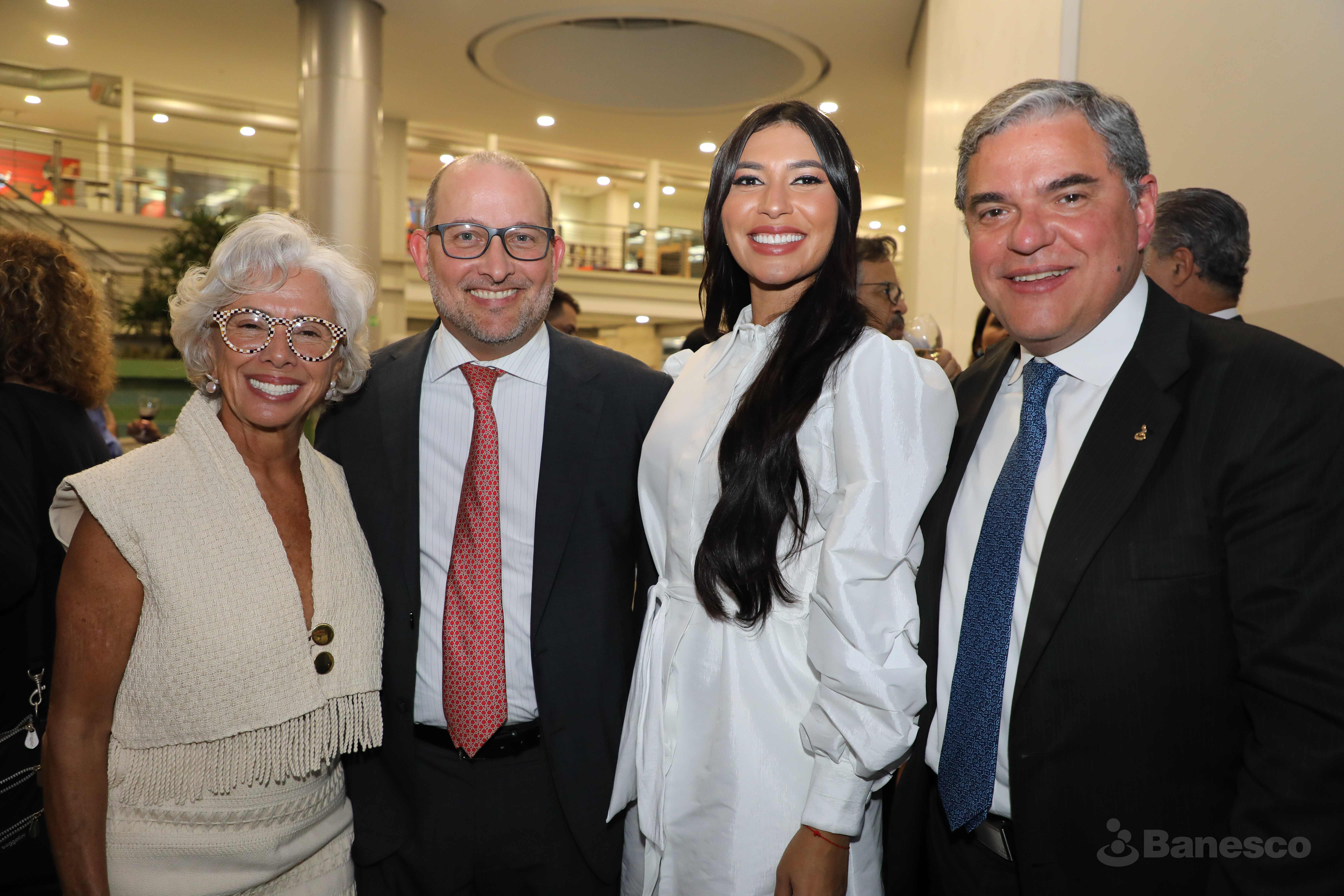 La periodista venezolana Valentina Quintero, el presidente ejecutivo Carlos Millán, Miss Zulia 2024 María Peinado junto al presidente de la Junta Directiva de Banesco Marco Tulio Ortega, disfrutando del brindis con motivo del bautizo del libro "La criolla principal" de la historiadora Inés Quintero.